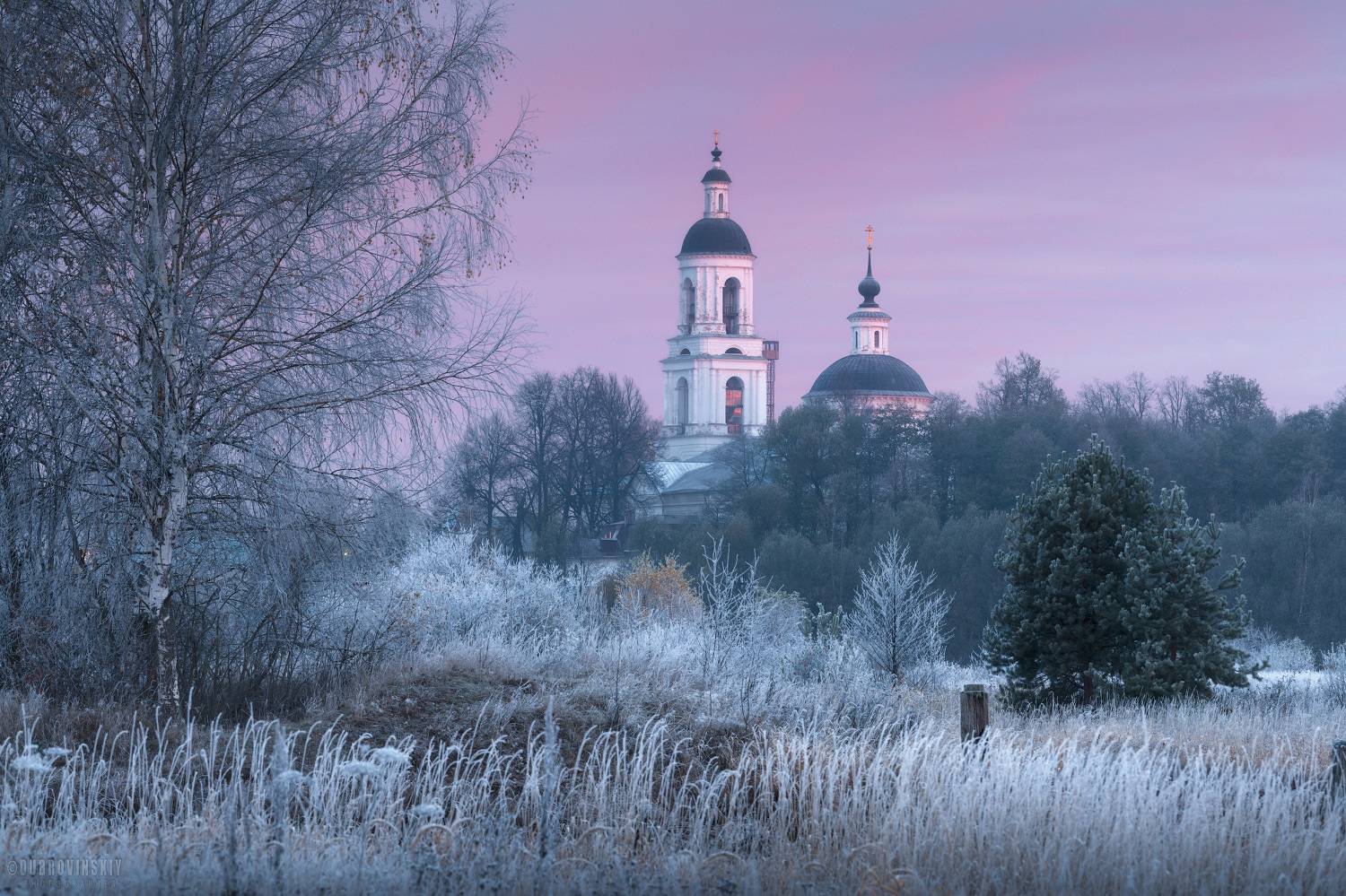 Серия кадров Михаила Дубровинского передаёт атмосферу тихого утра в Филипповском — храм в инее, лес в оранжево-красных тонах, морозный воздух. Каждый кадр — отдельный момент осенней тишины, застывшей в холоде и свету.