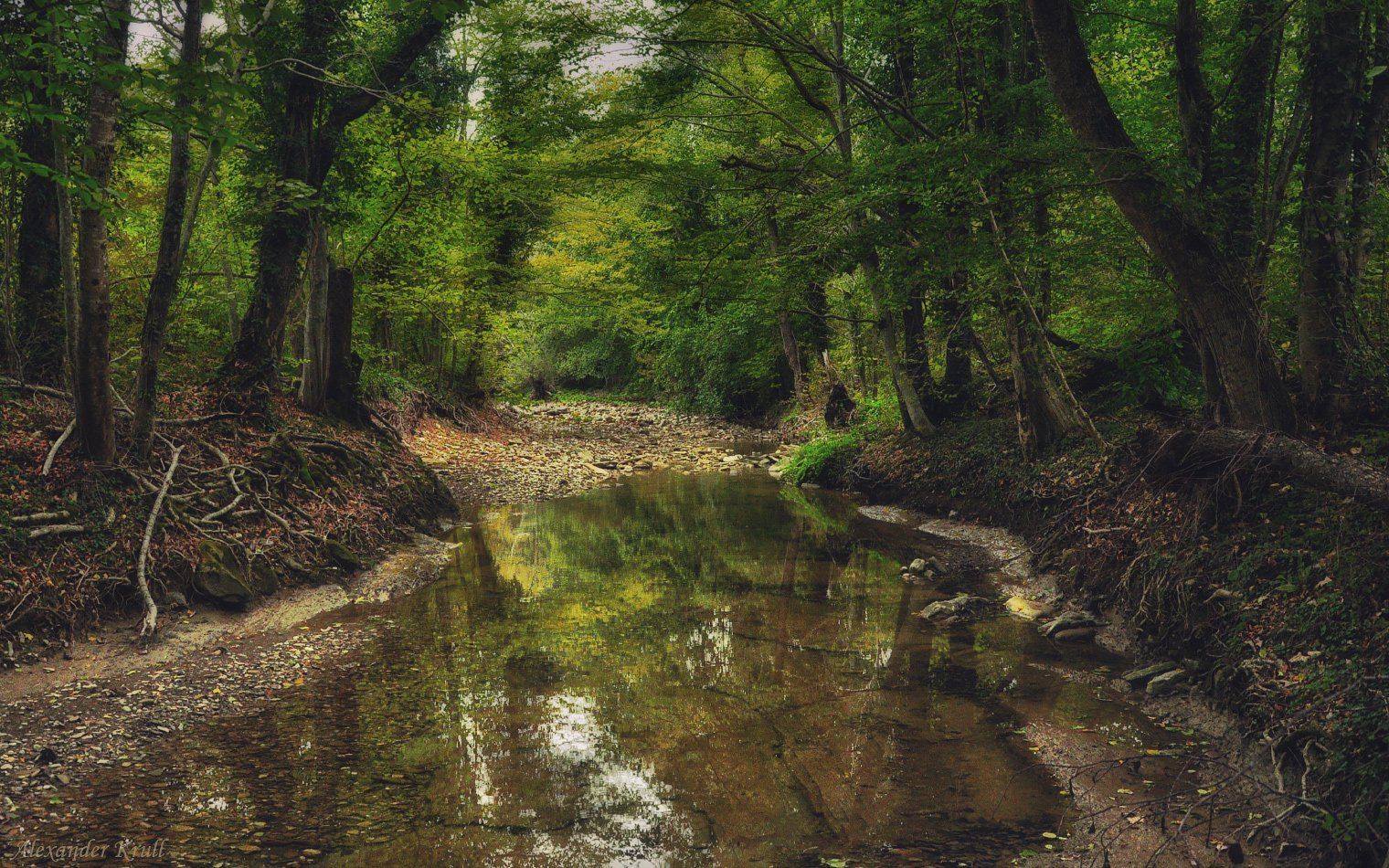 На берегу подходящая полянка, чтобы остановиться на ней. Должно быть синячили там... :) Гладь зелёная от отражений, а вообще вода кристально прозрачная.