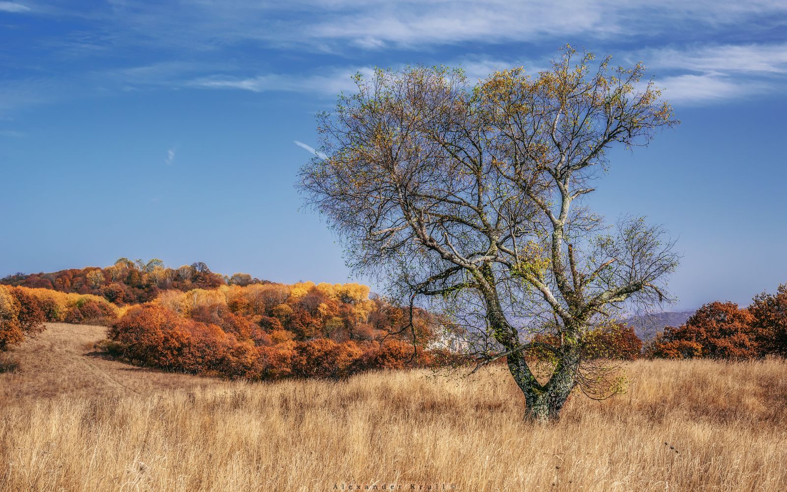 По этому фото сложно определить, но сделано оно вовсе не в полях где-нибудь на равнине, а на самой верхушке длинной куэсты под названием Ахмет-гора. Ахмет-гора находится в Карачаево-Черкессии почти на самой границе с Краснодарским краем. Протяженность Ахмет-горы, являющейся частью Скалистого хребта, порядка 5 км, наибольшая высота достигает 1313,7 метров над уровнем моря, высота обращенных на юг вертикальных скальных стен доходит до 200 метров. Наверху куэсты можно встретить вот такие чудесные пейзажи, с нее открываются великолепные виды на горы вплоть до Главного Кавказского хребта.