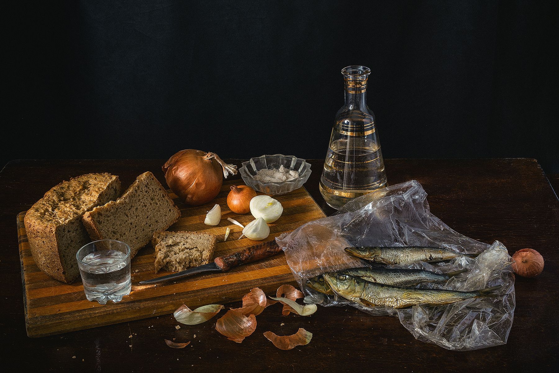 хлеб, лук, стопка, графин, нож, разделочная доска, Баг Алексей