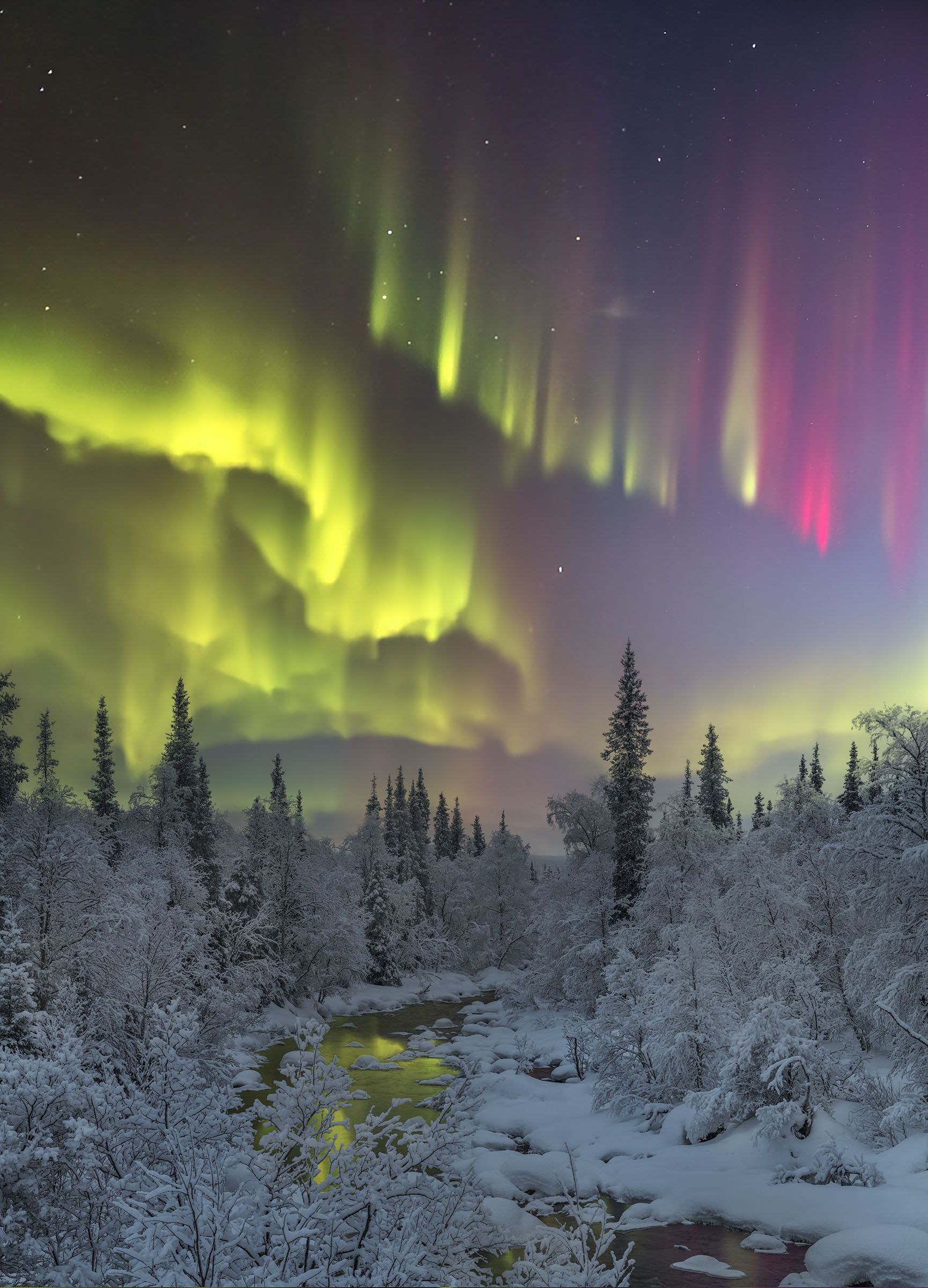 На снимке одна из рек Кольского, сфотографированная в феврале 2022 года. Полярное сияние сделало реку сказочной ареной, над которой разверзлось опаловое свечение с желтыми завихрениями и красными полосами. На сайте я подробно расписываю, как добраться до Кольского, как нам встретиться и как уехать с Кольского.