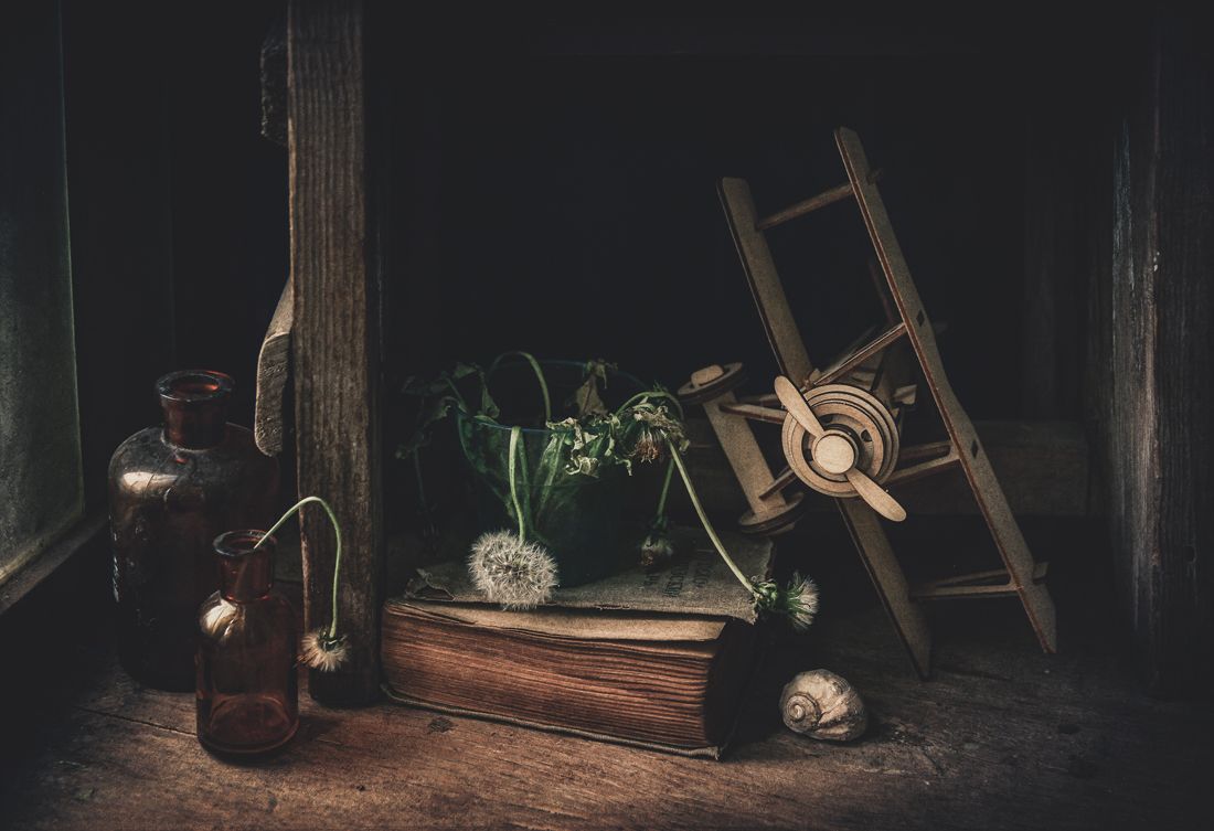 Чудесный свет, цвет подчеркивает интерес к винтажной теме в натюрморте.
