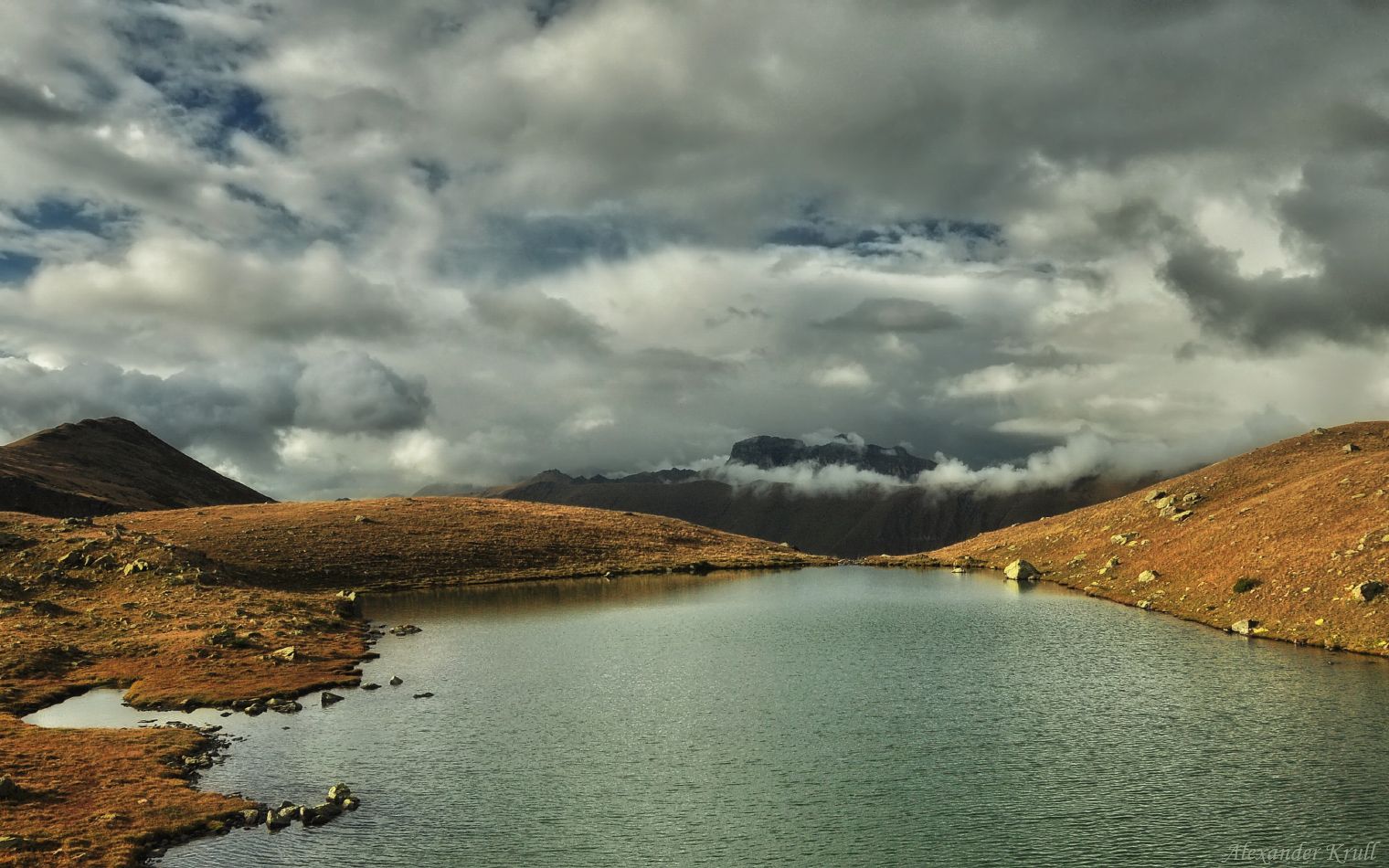 Карачаево-Черкессия, одно из группы озёр (Семиозерье) на северной оконечности хребта Аркасара. Впереди - хребет Абишира-Ахуба и виднеющаяся из-за него гора Загедан-Скала. Меня ожидала чудесная ночь - раскаты грома и молнии, порывы безумного ветра и сильный дождь. А пока я наслаждался затишьем и пробившимся лучом солнца...