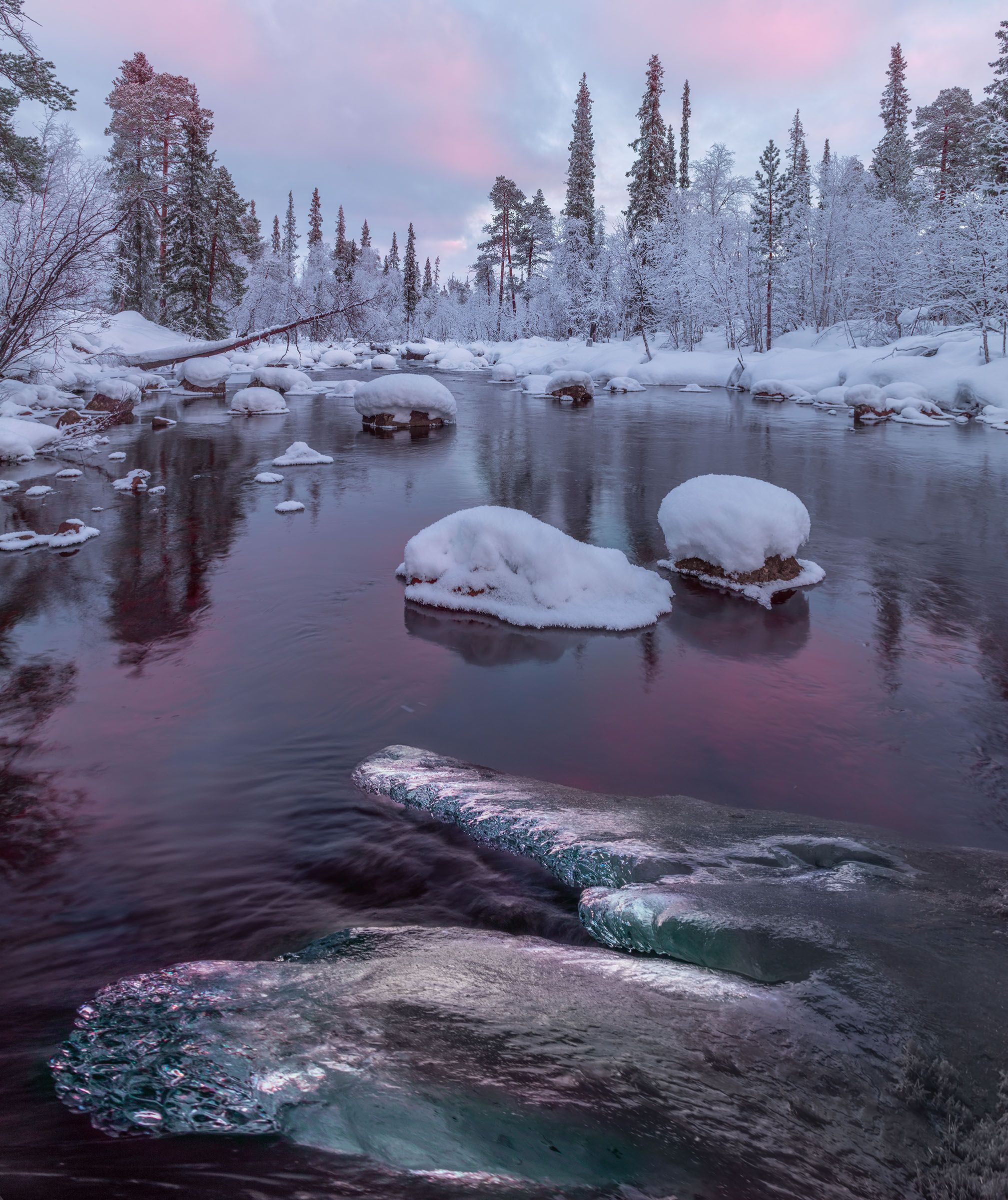 На снимке раннее утро на незамерзающей реке. Хотя слово раннее подходит с трудом. Время фотосъемки 11:18. Облака закраснелись немного в рассветных лучах и упали цветными пятнами на реку. На переднем плане намерзающий лед на реке, особенно на меня произвело впечатление игра двух контрастных цветов – зеленого льда и отражающегося в нем небесного пурпура. Мы приезжали сюда дважды во время первого тура и еще раз во время второго. У меня было два тура подряд. Немного морозило, что-нибудь двадцать пять минус. Хотя здесь морозец переносится легко, не то, что в Питере или Подмосковье. В Москве минус двадцать пять – это ого-го. А здесь вообще морозец не чувствуешь. Вообще в последнюю поездку я понял, что надо ездить в ноябре – снег не глубокий. И реки везде не замерзшие. Жили мы в гостевых домах. Везде было неплохо. Готовили сами. По очереди.