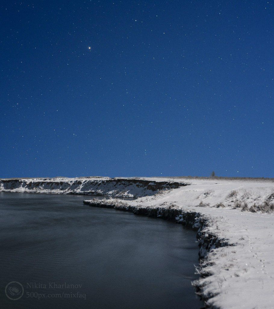 луна, река, вода, берег, зима, лед, снег, звезды, звездная ночь, астрономия, астрофотография, Харланов Никита