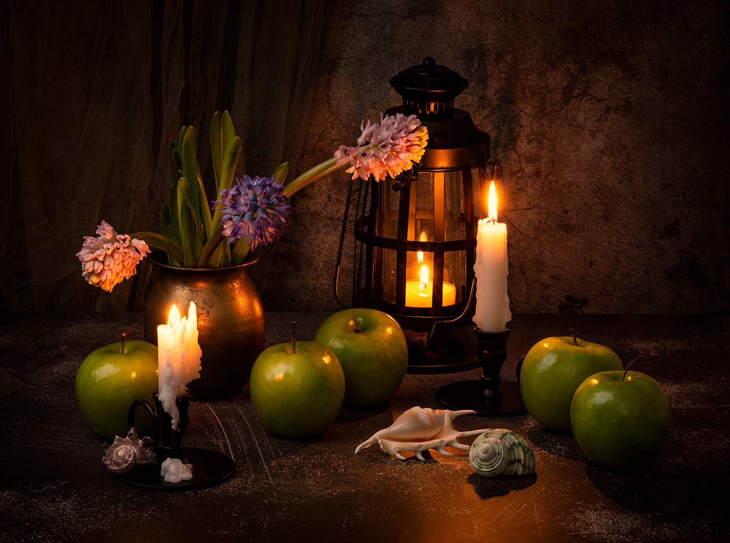 свечи, яблоки, гиацинты, ваза, ракушки., Рут