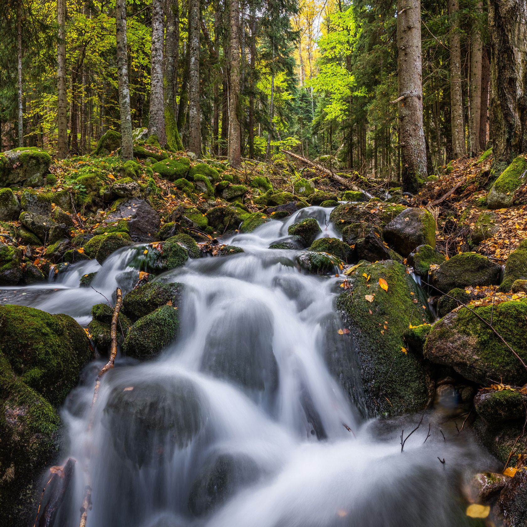 Живописный лес у ручья Шумка на севере Тебердинского заповедника. Карачаево-Черкесская республика, октябрь 2024 г.