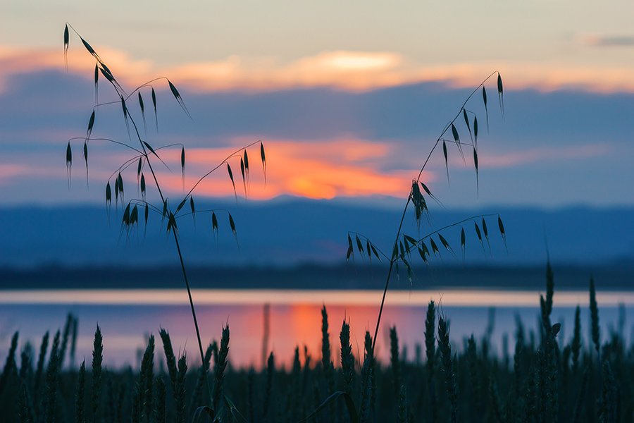 Природа, закат, озеро, горы, злаковые, пшеница, овес, небо, облака, Александр Кожухов