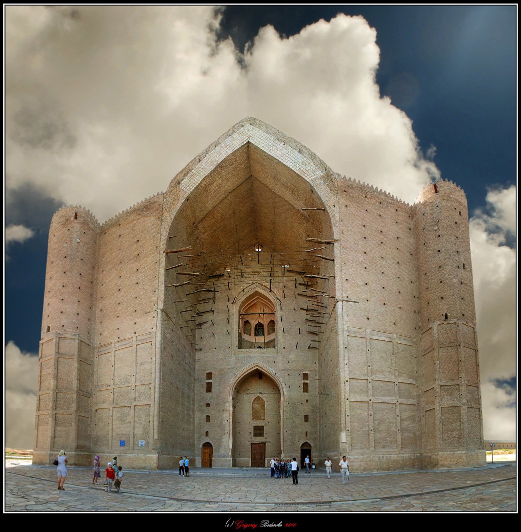 Казахстан. Город Туркестан. Мавзолей Хаджи Ахмета Яссауи. Яссауи жил в 12-м веке. Он был мусульманином-суфистом и создал особую форму казахского Ислама под названием "тюрский тарикат". Основа философии Яссауи - это методология постижения Бога интуцией, самопознание, медитация. Тарикат также, считается мистическим направлением в Исламе. В Средней Азии Хаджи Ахмет Яссауи почитается, как святой, а его мавзолей входит в реестр ЮНЕСКО, как величайший памятник исламской архитектуры.