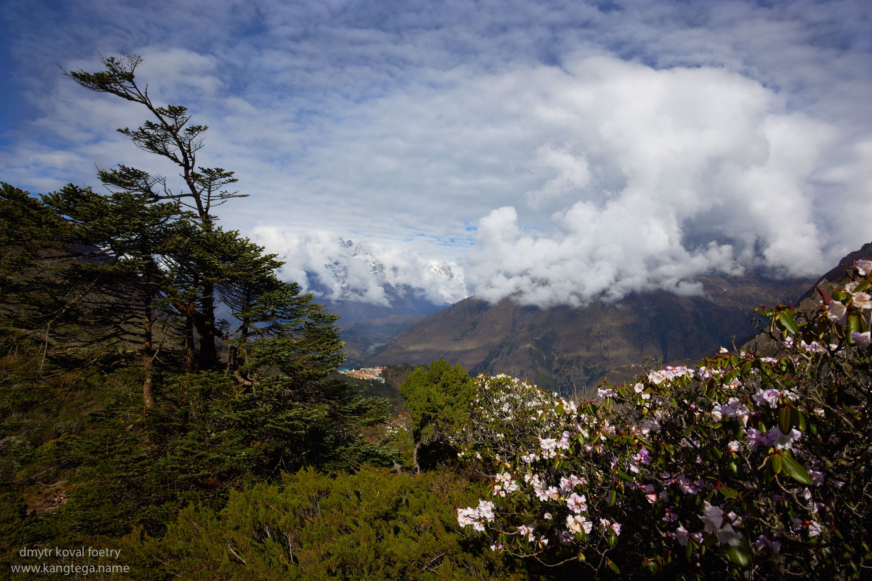 Вид из дебрей смешанного леса – цветущих бонсайных рододендронов, можжевельника и талисы (гималайской ели) на Тенгбоче гомбу (монастырь), что на высоте 3 880 м., и над ней на бастионы Конгдэ Ри 6 100 м. захлёстываемые облакопадом …