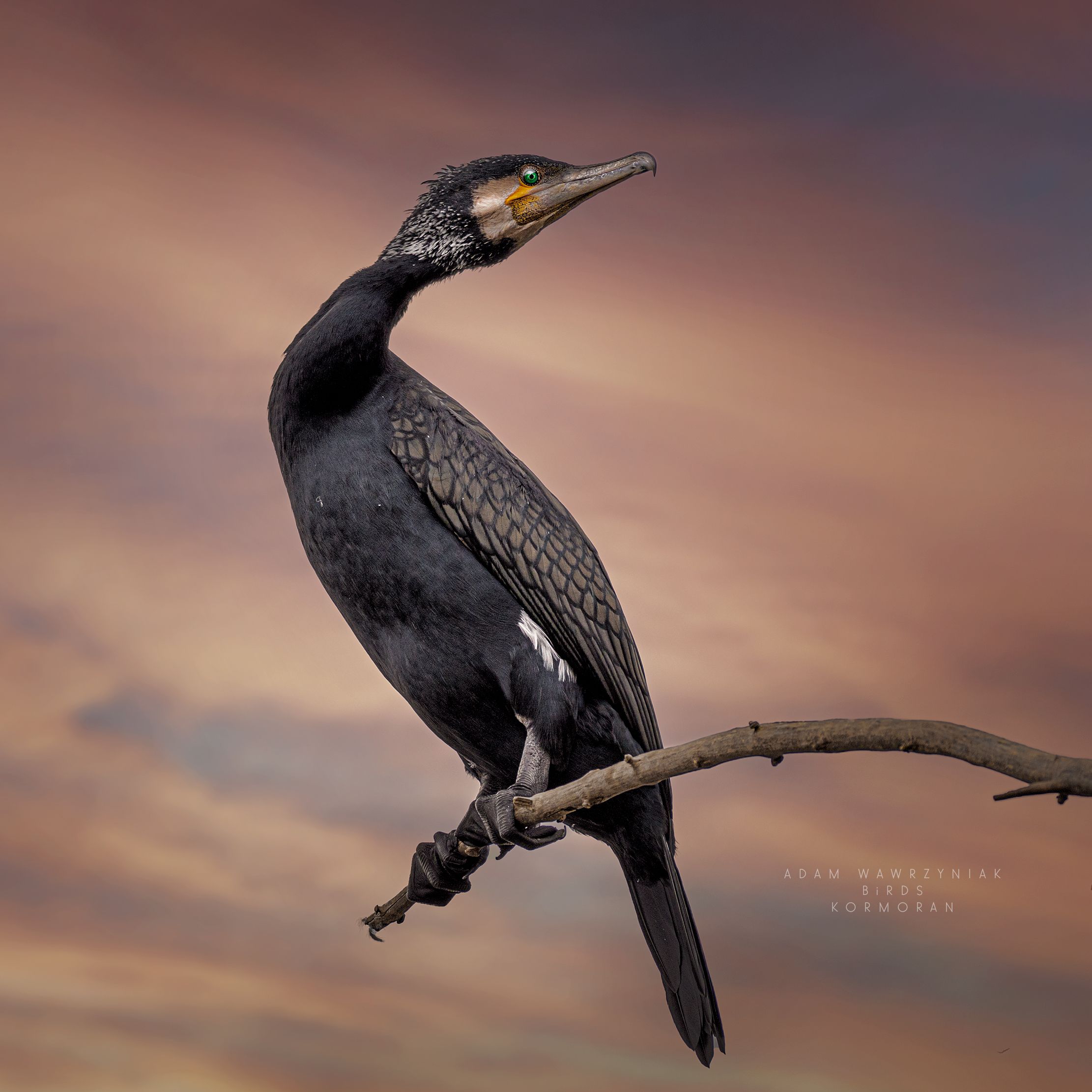 На изображении — корморан, застывший в спокойной позе на тонкой ветке. Его чёрное оперение с блестящими перьями выделяется на фоне драматичного неба, окрашенного в оттенки оранжевого и фиолетового. Птица смотрит в сторону, словно наблюдая за уходящим днём. Снимок передаёт тишину и уединение природы в момент перехода от дня к ночи. Фотография отражает гармонию между животным и окружающей средой, подчёркивая красоту дикой природы в естественной обстановке.