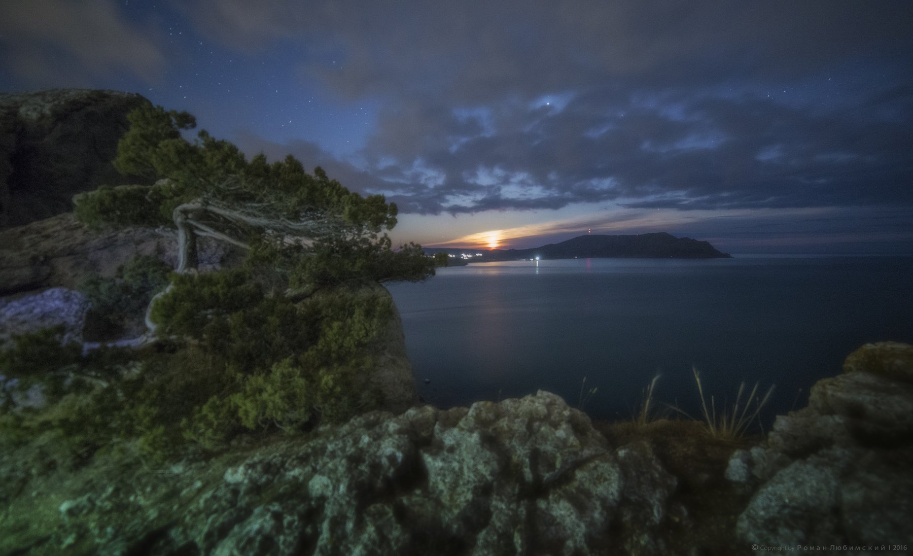 восход, пейзаж, луна, вечер, облака, море, судак, крым, небо, сосна, Роман Любимский