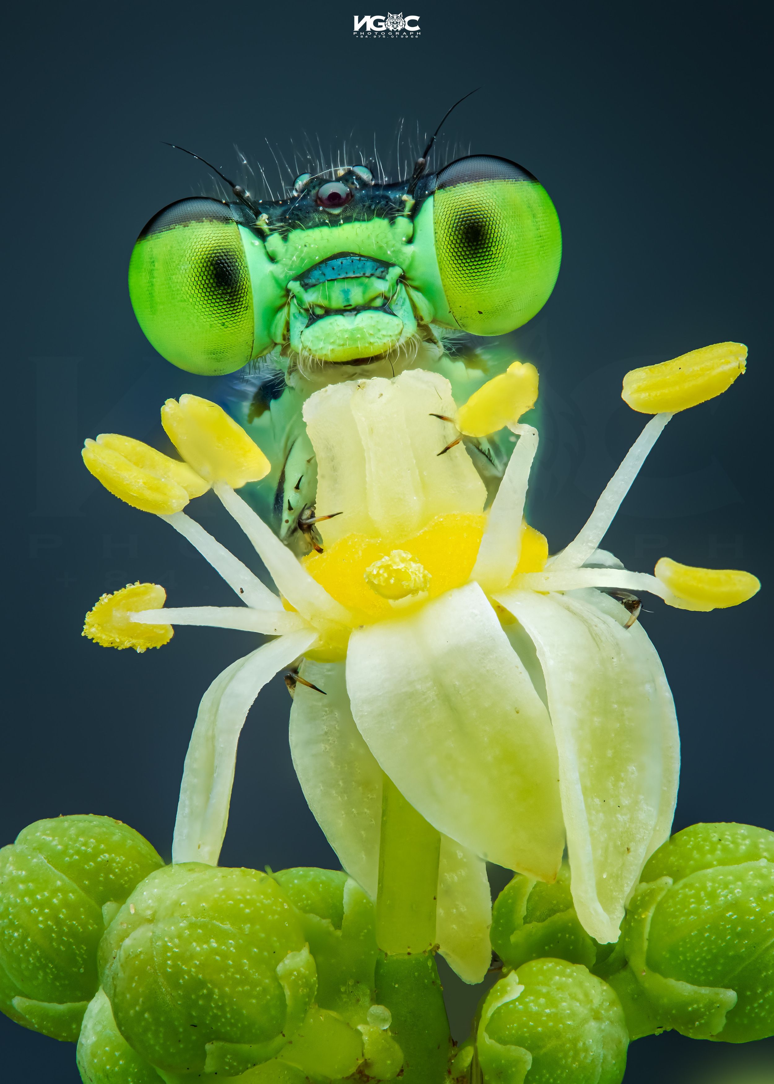 Фотограф Tran The Ngoc запечатлел стрекозу в момент её пребывания на цветке, подчеркнув необычную окраску глаз и тонкую структуру растения. Ярко-зелёные глаза насекомого смотрят прямо в объектив, создавая эффект прямого контакта. Контрастный тёмный фон усиливает визуальную выразительность снимка. Макросъемка позволяет увидеть детали, недоступные невооружённому глазу — от чешуек на крыльях до пыльцы на тычинках. Снимок — пример точного и эстетичного документирования природы.