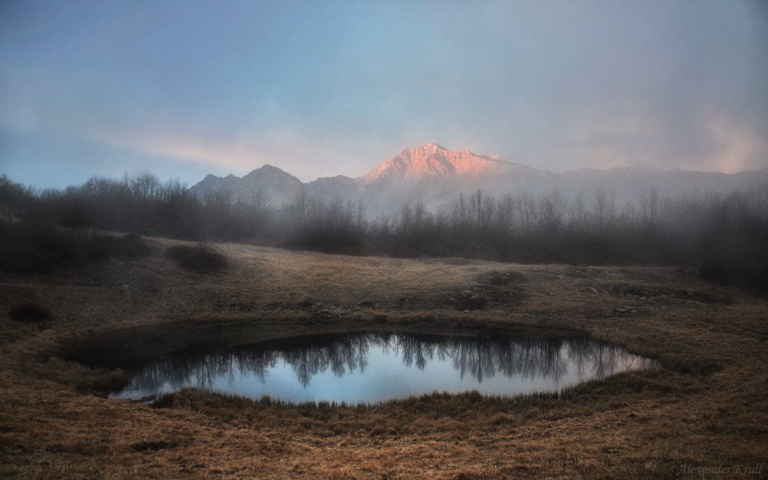 Окрестности Красной Поляны, туманный вечер на красивой поляне с озером Зеркальным на отрогах горы Ачишхо. На ЗП в лучах заходящего Солнца высочайшая вершина Адыгеи - гора Чугуш (3238.2м).