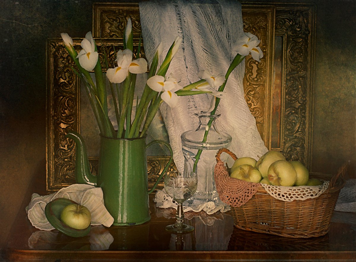 Ирисы, Натюрморт, Чайник, Яблоки, Надежда Власова