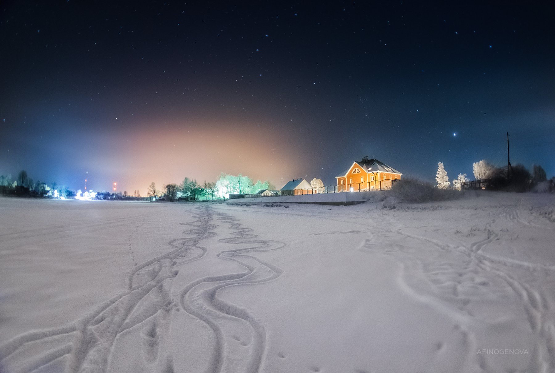зима, снег, мороз, ночь, Звезды, дорога, следы, свет, здания, постройки, Татьяна Афиногенова