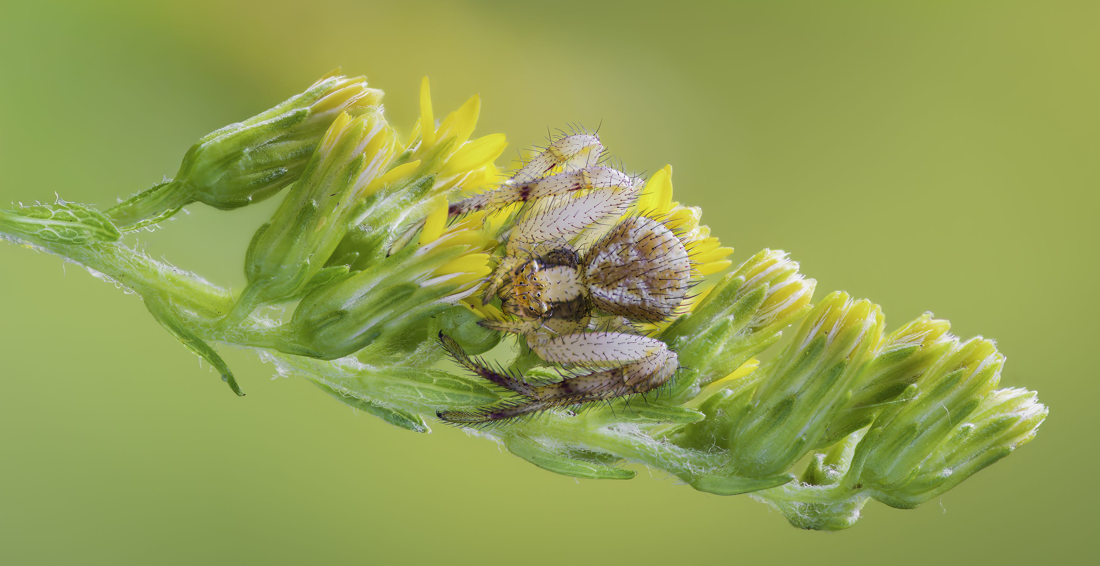 На снимке запечатлён паук, устроившийся на нежном желтом цветке — его временный дом в дикой природе. Макрофотография позволяет увидеть тонкие детали: шероховатость тела, изящные ноги, контраст с яркими лепестками. Это не просто снимок — это момент жизни, где маленький арахнид стал центром внимания. Фотография передаёт гармонию и хрупкость природы, напоминая, что даже в самых незаметных уголках мира кипит жизнь. Каждый кадр — история, которую можно прочитать в деталях.