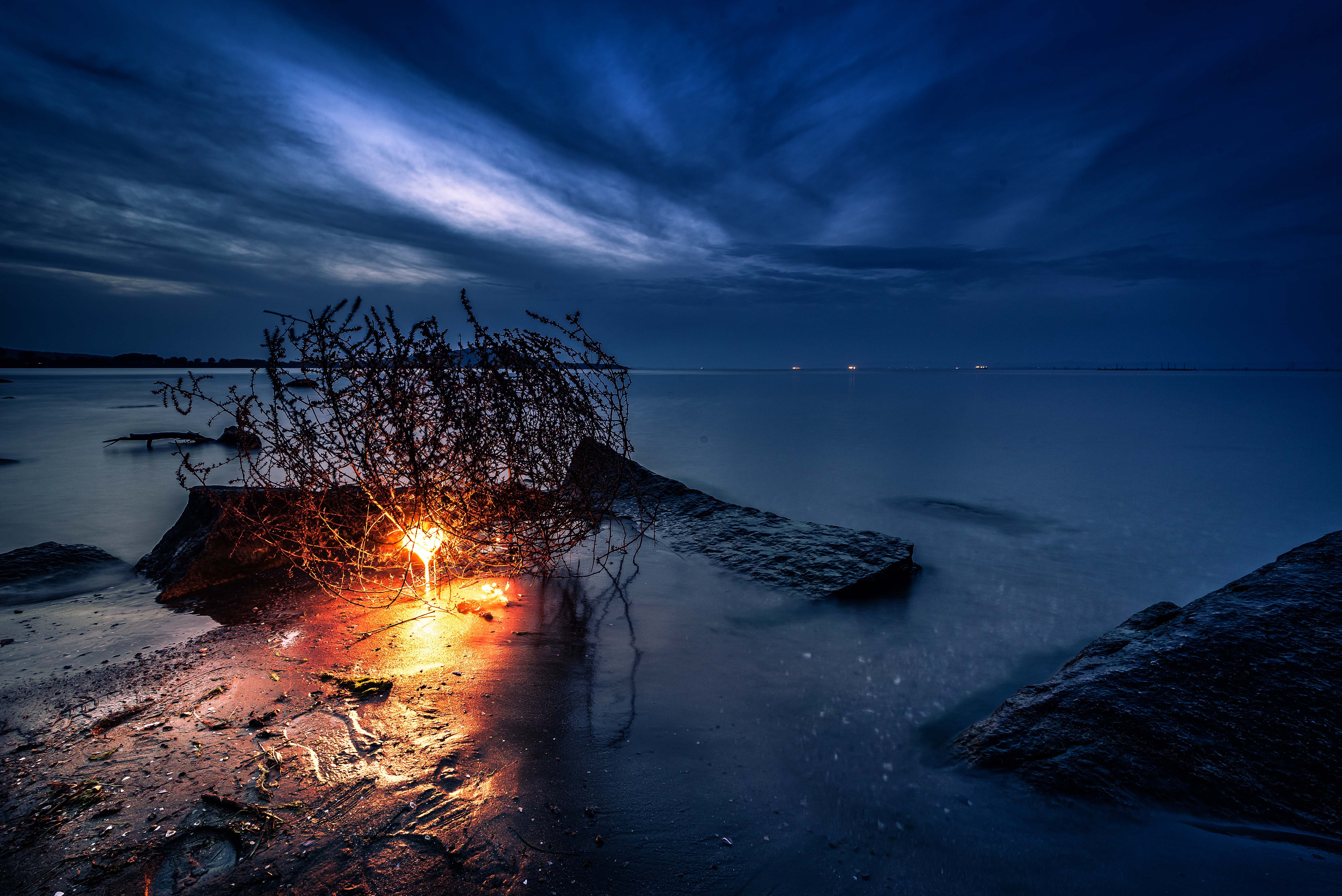 sea, blue hour, sky, fire, heart, sand, water, seascape, Jeni Madjarova
