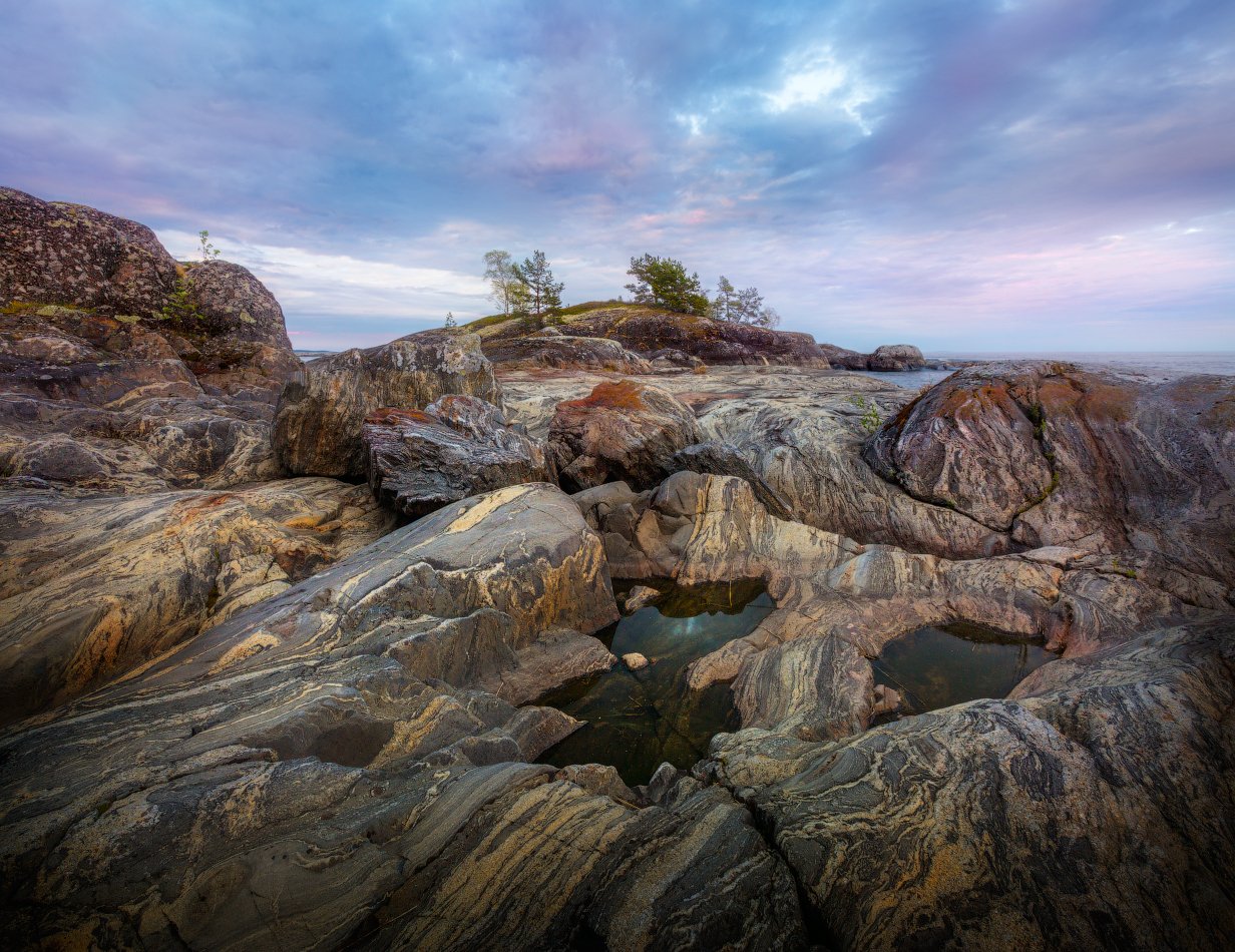 Ладога, вечер, камни, волны, небо, скалы, вода, Cтанислав Малых