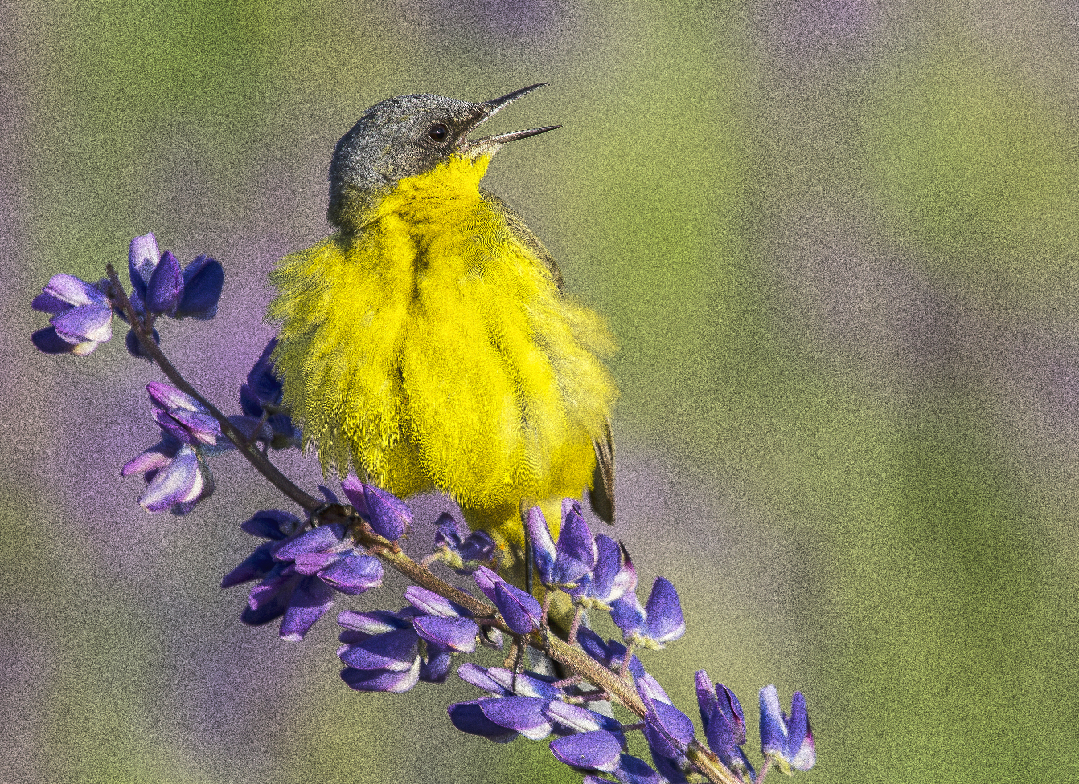 Яркий контраст жёлтого оперения трясогузки и фиолетовых люпинов создаёт живое, насыщенное изображение. Удачный ракурс и мягкий фон подчёркивают детали птицы.