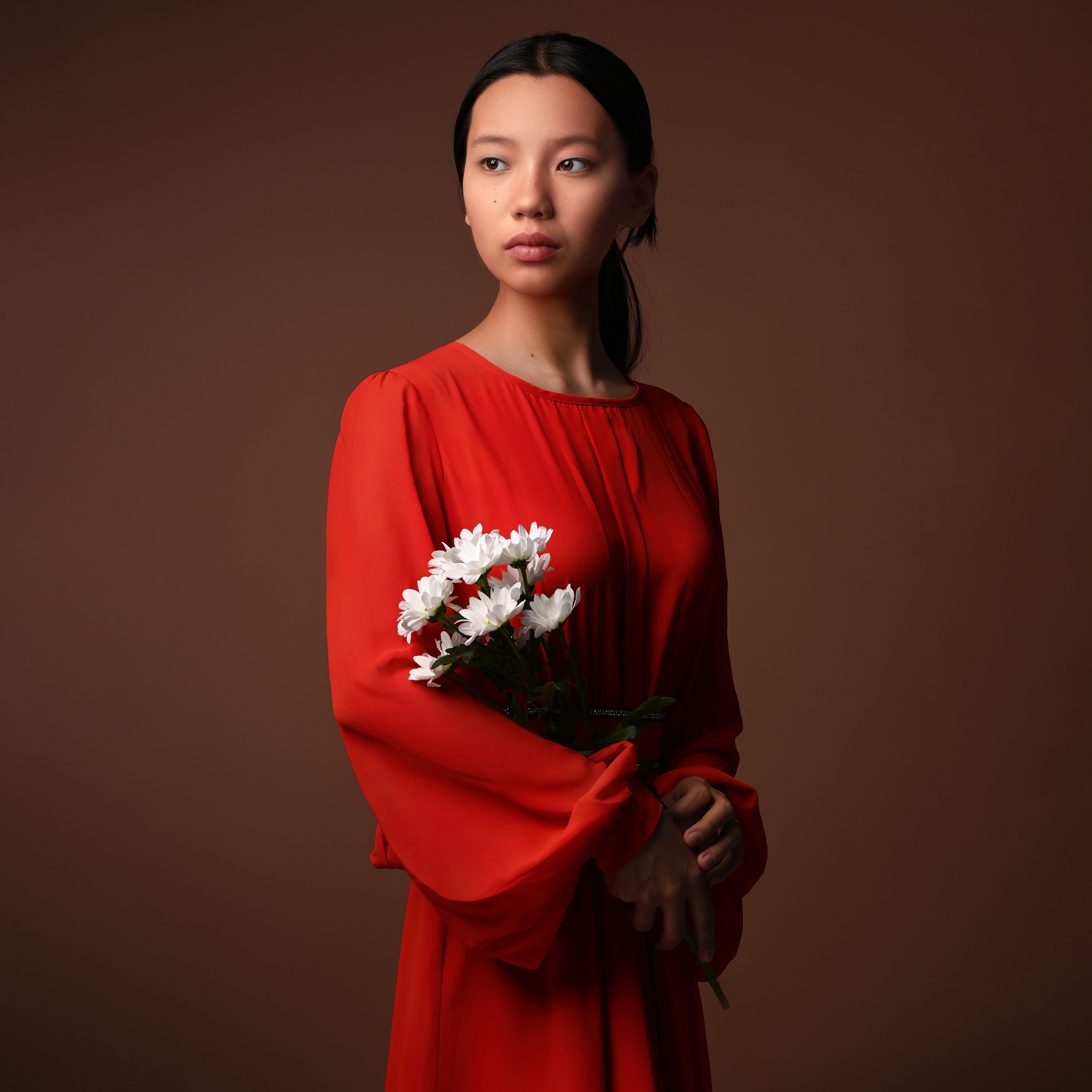 Денис, спасибо за фото — выглядит очень чисто и сдержанно. Красное платье, белые цветы, тёплый фон — всё лаконично, но в то же время глубоко. Глаза девушки — как будто что-то скрывают, но в то же время открыты. Хорошо сработал контраст, и поза — естественно, без напряжения. Красиво, по-настоящему.