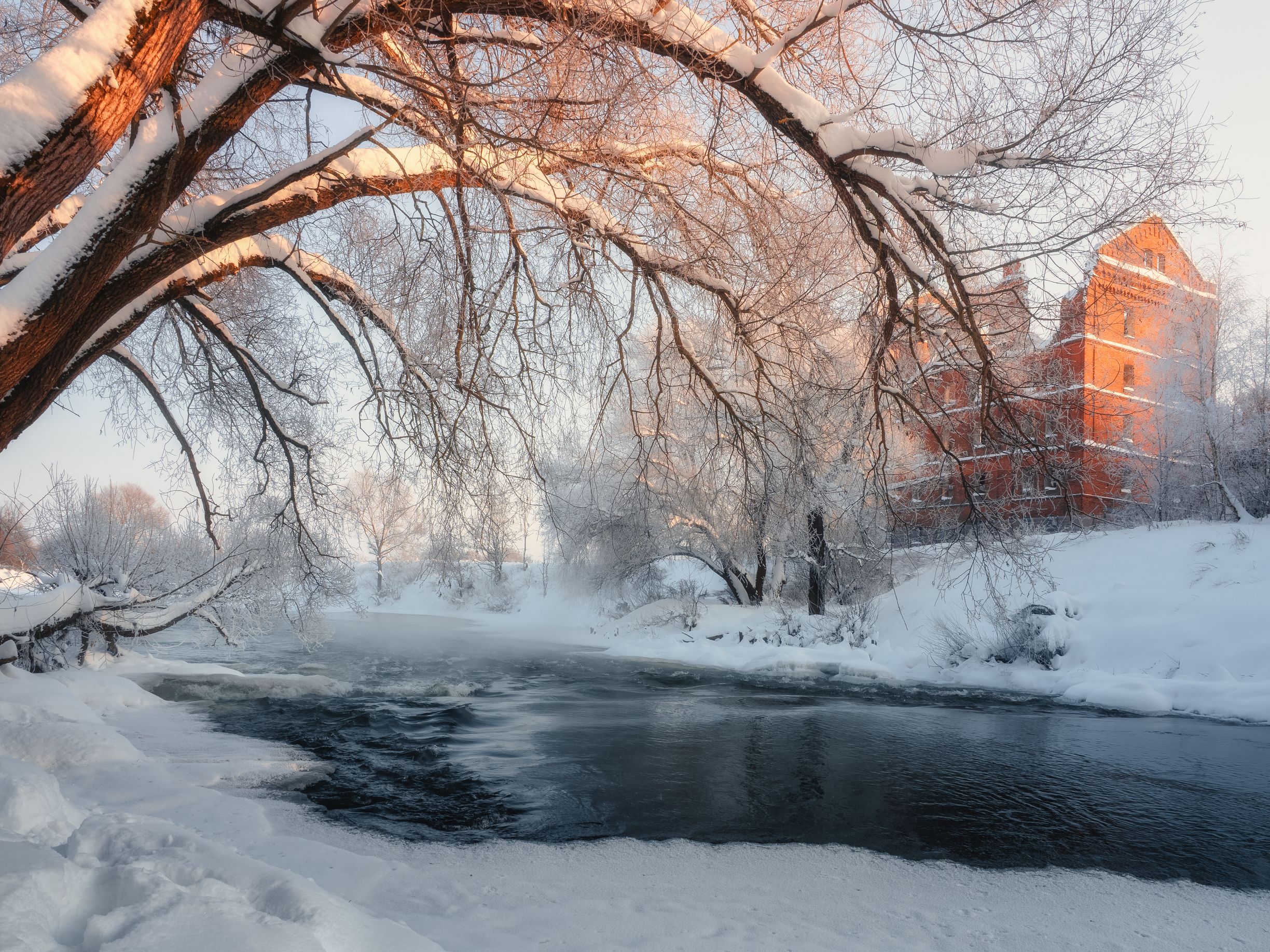 Снег на ветвях, тихая река — всё выглядит спокойно и чисто. Видна старая мельница — добавляет сюжета.