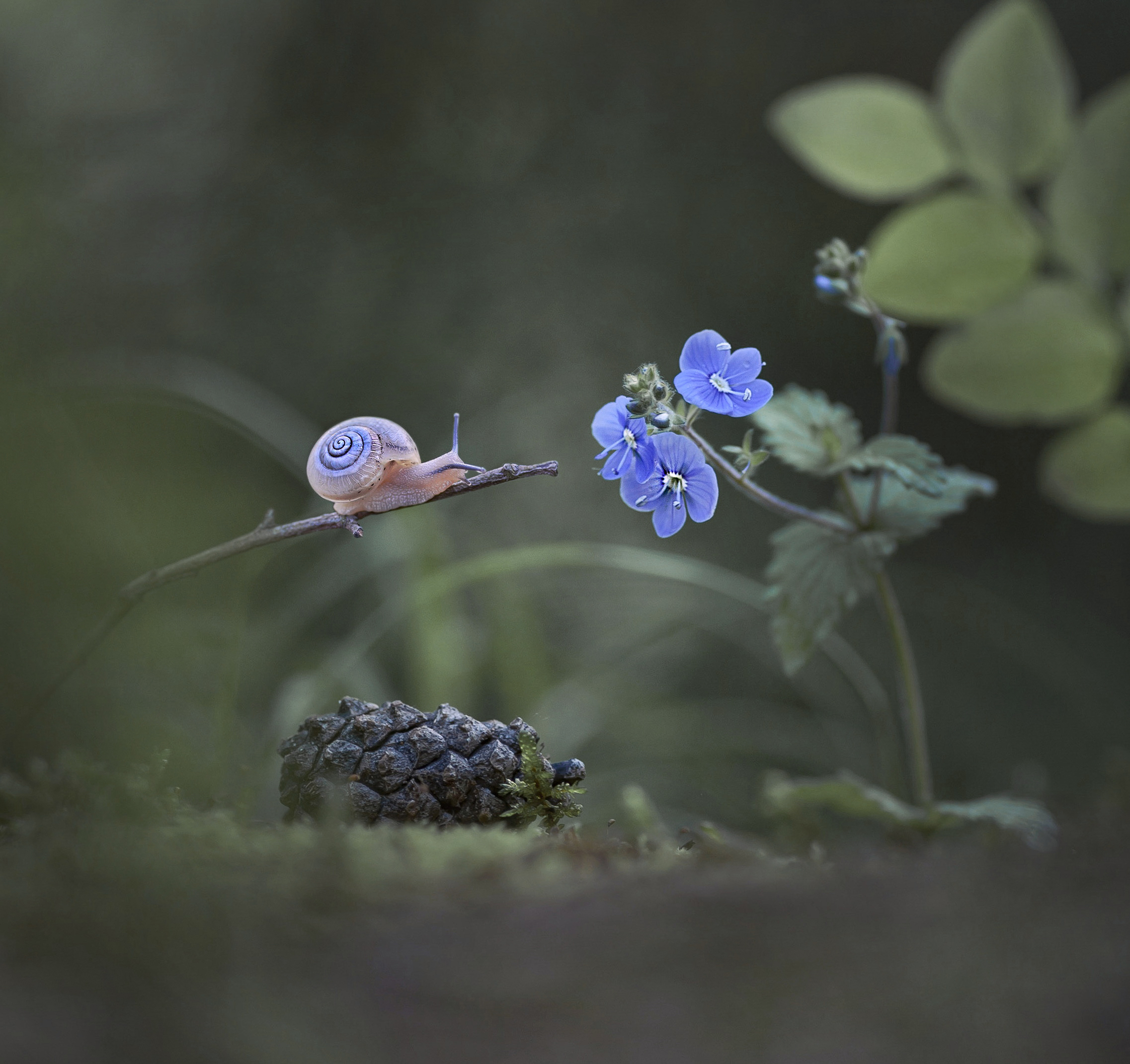 Улитка на ветке, словно взвешивает шаг к цветку — момент застывший, но полный движения. Макро-рамка передаёт тонкость жизни: шелушащаяся раковина, нежные лепестки вероники, шишка внизу — как ступенька к свету. 🌿