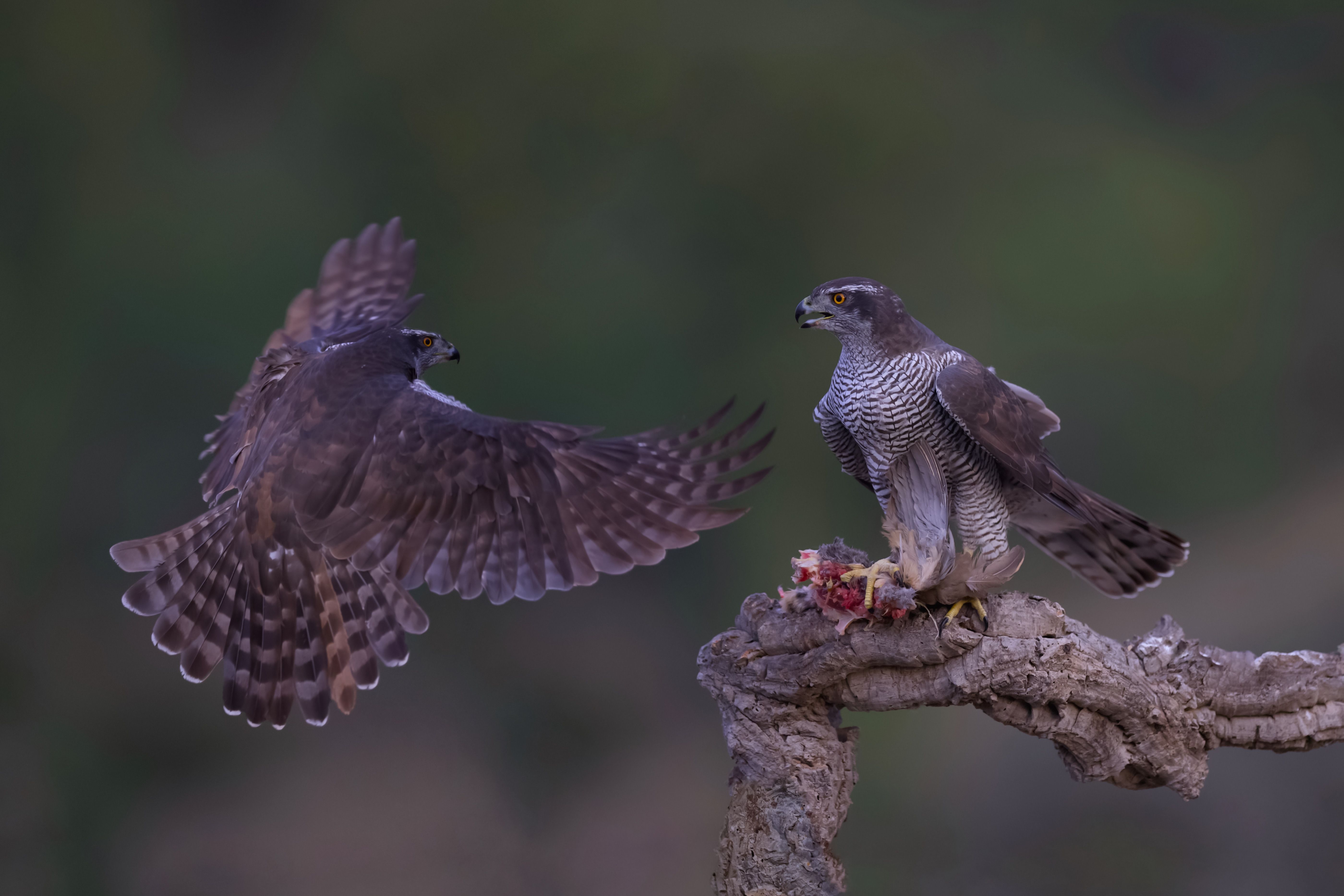 Отлично пойман момент — два сокола в напряжённом противостоянии, один в полёте, другой с добычей на ветке. Динамика, освещение и фокус — всё на месте. 🐯✨