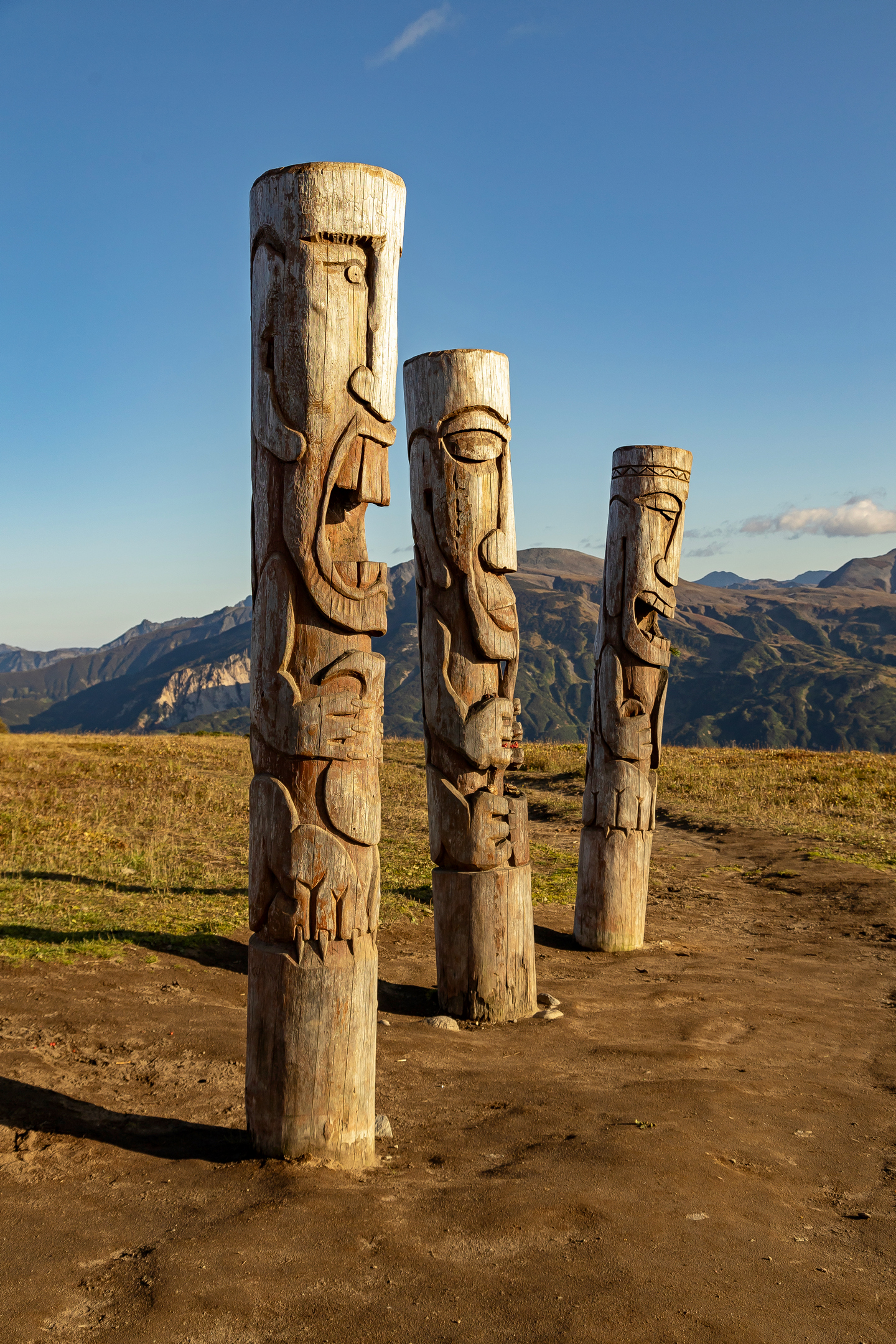 Вид с Вилючинского перевала в сторону сопки Мутновской.. С вершины перевала в хорошую погоду открывается панорамный вид на девять вулканов, включая Вилючинский, который отличается правильной конической формой и всегда покрыт снегом. На смотровой площадке установлены три деревянных идола — гамулы, которые, согласно местным поверьям, являются духами-хранителями перевала. Один из идолов держит кита, другой курит трубку, а третий — с бубном, что отражает традиции коренных народов Камчатки.