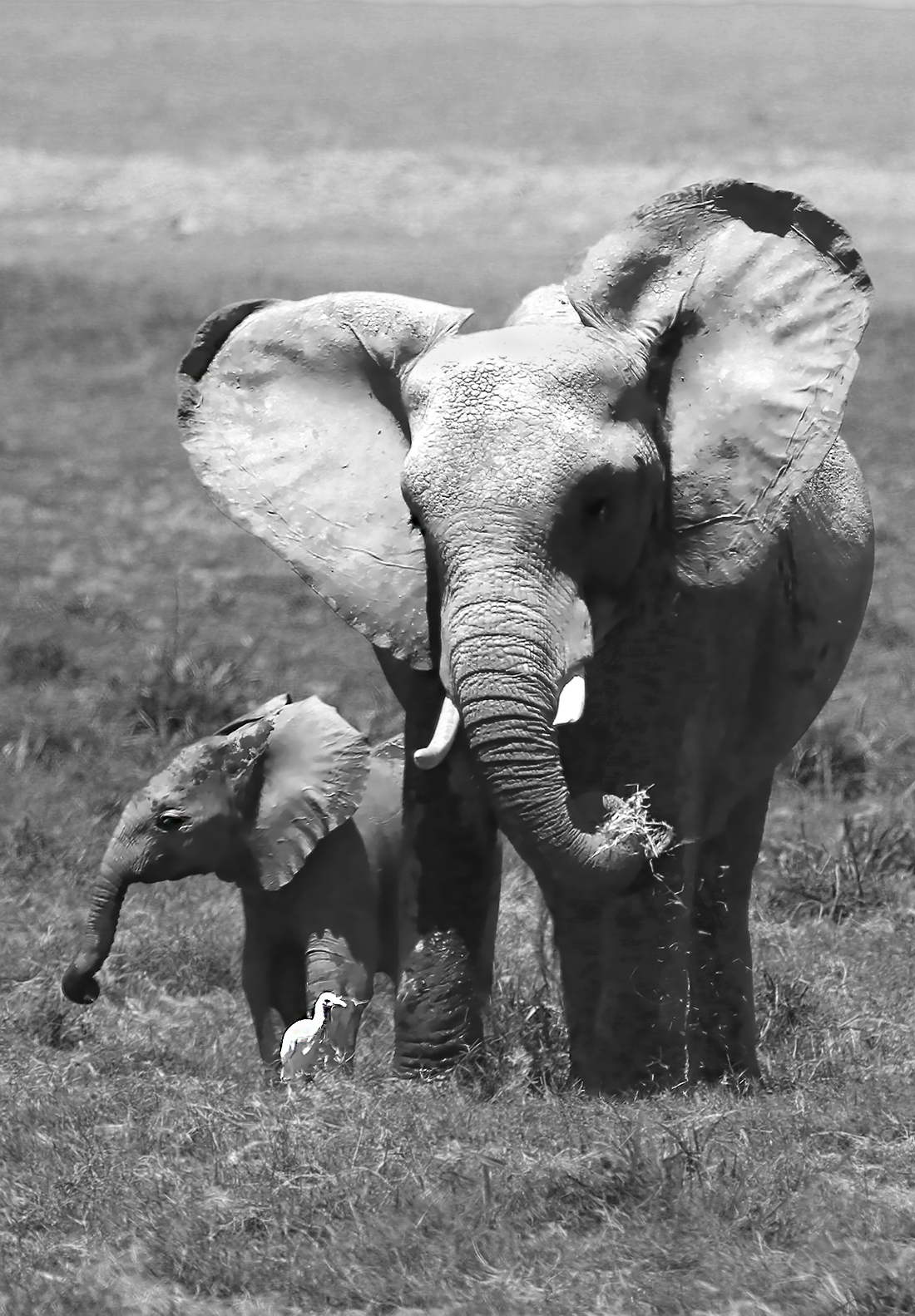 Вера, красиво снято — контраст между взрослым слоном и малышом передаёт связь поколений. Чёрно-белая гамма подчёркивает текстуру кожи и игру света на ушах, а композиция устойчива и естественна.