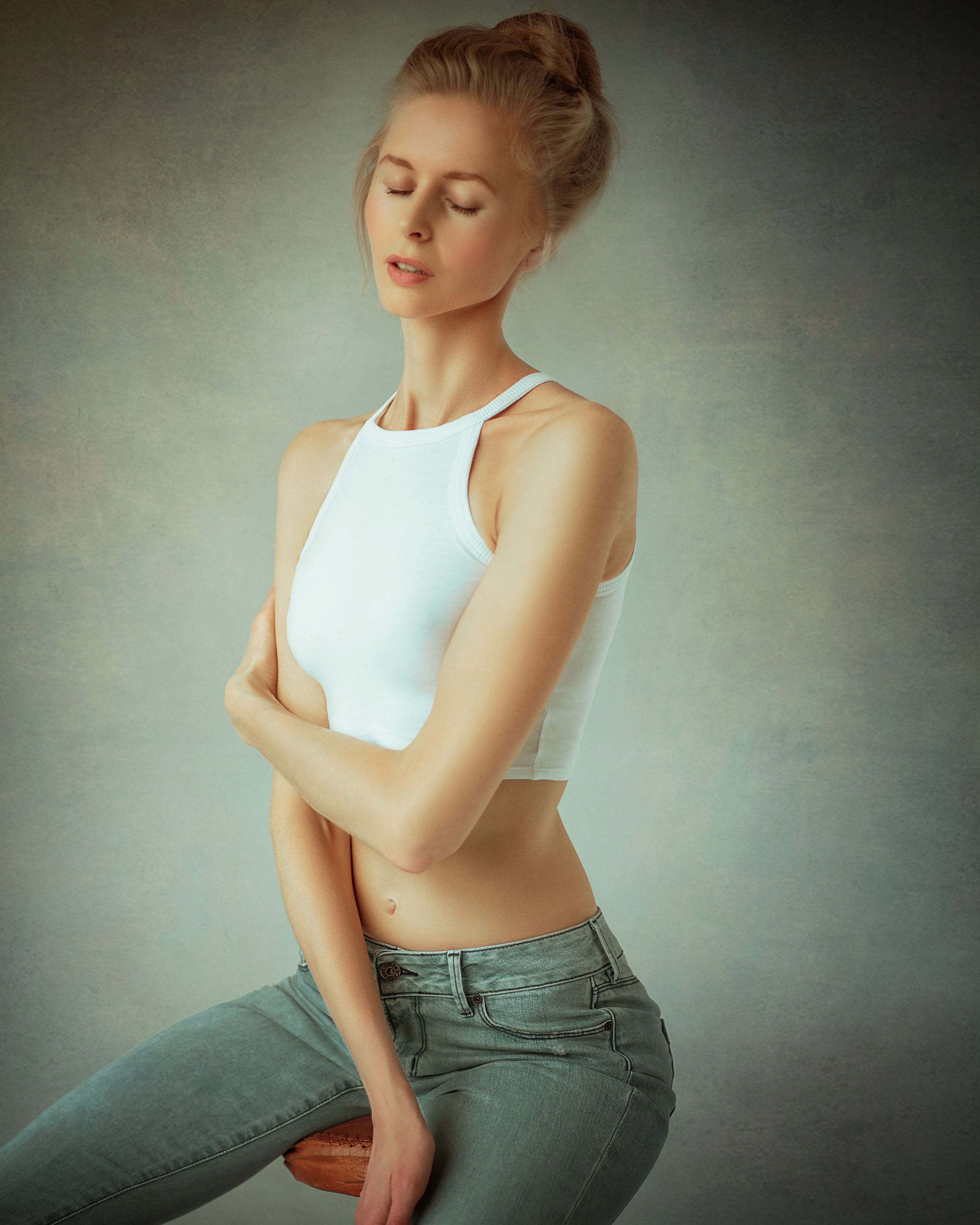 Снимок вышел очень натурально — свет мягкий, поза естественная, взгляд закрыт, но выражение спокойное. Белый топ и джинсы — простота, но с акцентом на линии тела. Студия работает на пользу: фон не отвлекает, а подчёркивает. Хорошо сделано.