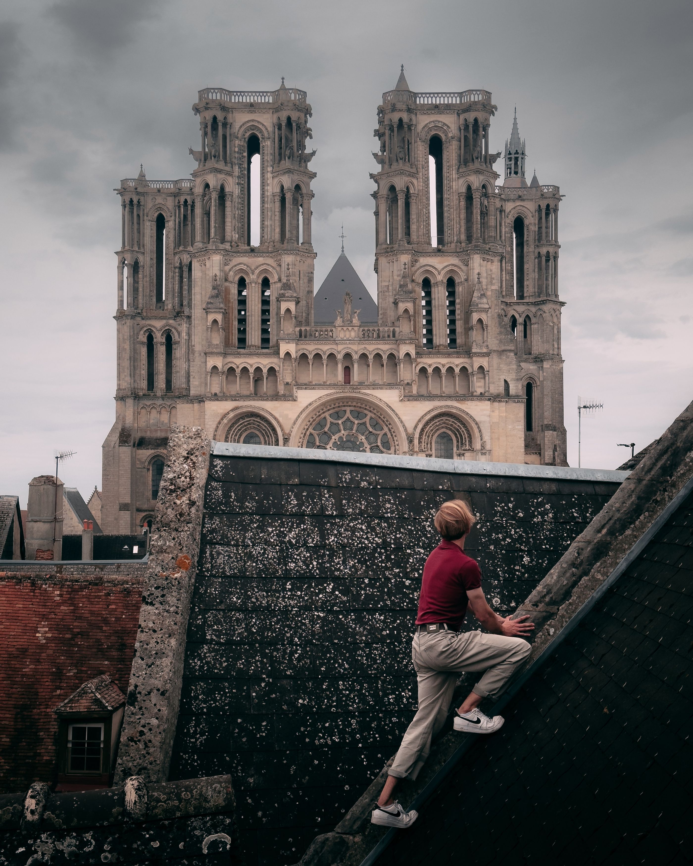 Фотография передаёт масштаб и архитектурную мощь собора Нотр-Дам де Лан, контрастируя его с фигурой человека на крыше. Композиция чёткая, перспектива выстроена удачно — можно усилить контраст между светом на фасаде и тенями на крыше для большей выразительности.
