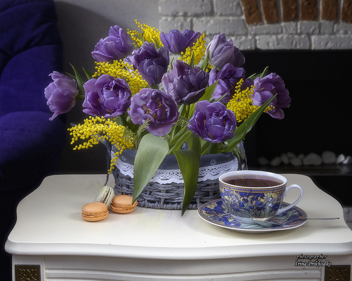 натюрморт, цветы, тюльпаны, мимозы, чайный столик, Приходько Ирина