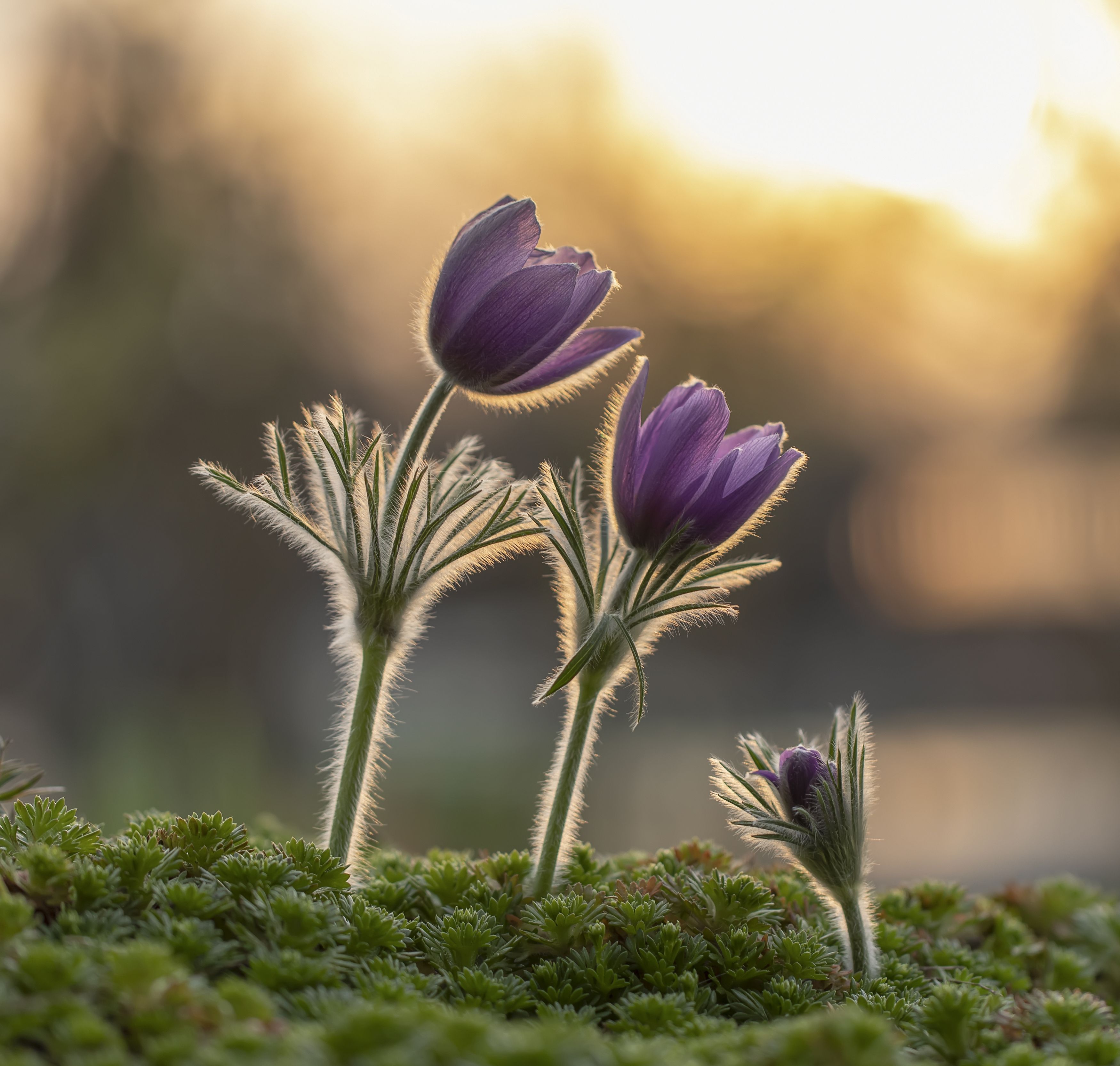 В тишине ранней весны три прострела возвышаются над зелёным ковром, словно три тихих свидетеля пробуждения природы. Золотистый свет заката ласкает их нежные фиолетовые лепестки, подчёркивая хрупкость и силу жизни. Это мгновение — символ начала, когда земля вновь дышит, а каждый цветок — шаг к новому сезону. Фотография передаёт тонкую грусть и радость одновременно: весна пришла, и она — для троих.
