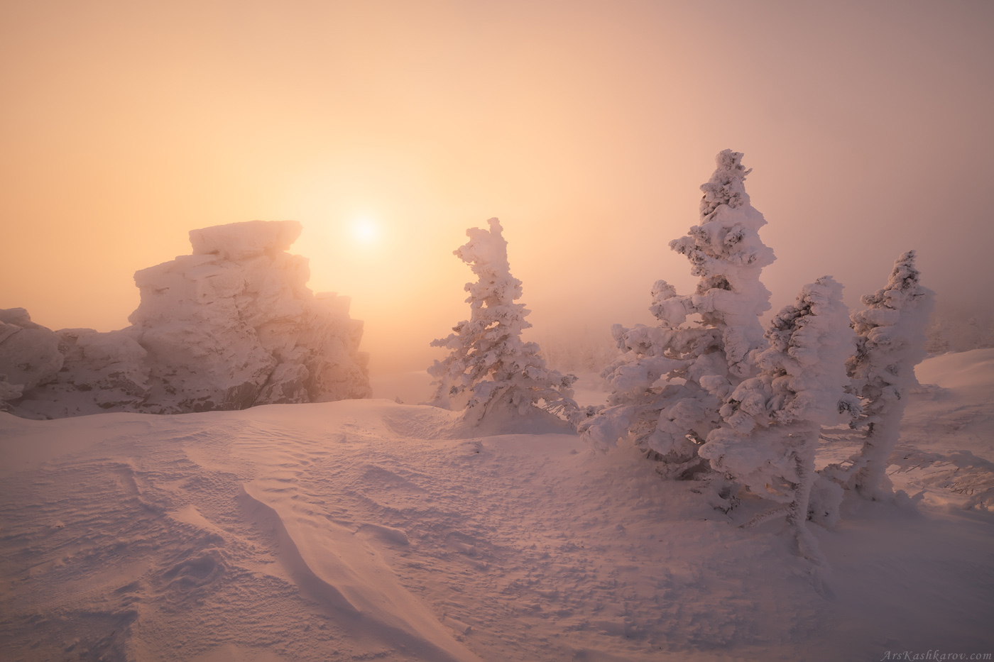 Когда я к вечеру добрался до метеостанции на Таганае, надежды на утреннюю съемку практически не было. Все вокруг было затянуто плотными облаками, видимость не превышала 15 метров. Прогноз тоже был не утешительный. Однако уже в преддверии восхода облачность понемногу начала рассеиваться, сквозь туман начали проглядывать облака среднего яруса, а потом появилось и солнце