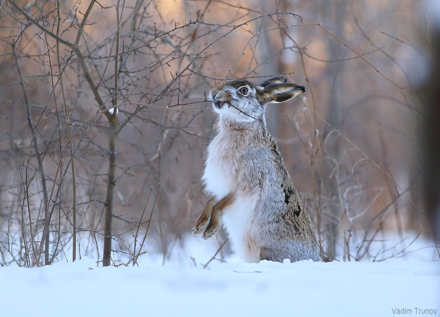 Заяц на жировке — кадр получился живо и естественно, с хорошей передачей зимнего настроения. Вадим, ты уловил момент, когда зверёк, кажется, только что проснулся от сна и оглядывается — это и есть суть.