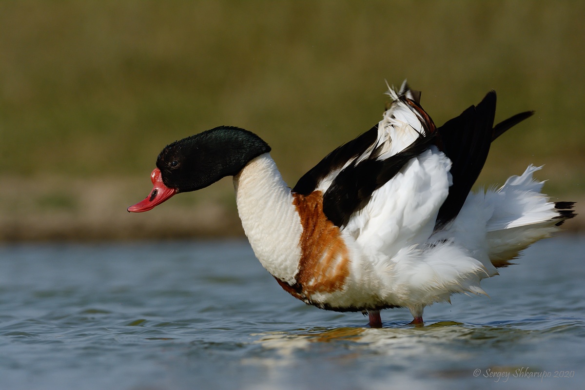 Сергей, пеганка в кадре — как будто остановилась в движении, смотрит в сторону, будто что-то замечает. Контраст чёрного, белого и рыжего — чёткий, живой, а красный клюв — акцент, который не выделяется, а вписывается. Хороший выбор угла и света.