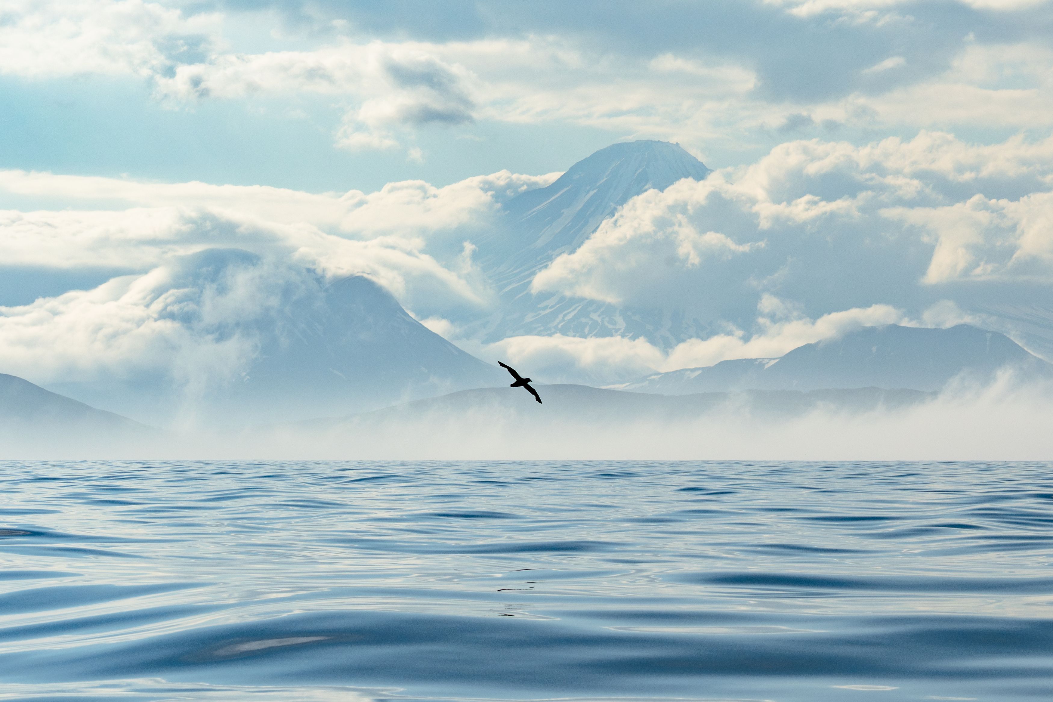 Проходя Камбальную сопку по пути на Курильские острова, я вышел на палубу и был поражён видом. Гладкая, спокойная вода и вершина вулкана, проглядывающая сквозь облака. Композицию достроила пролетающая мимо птица. Неожиданно красивый сюжет для не режимного времени.