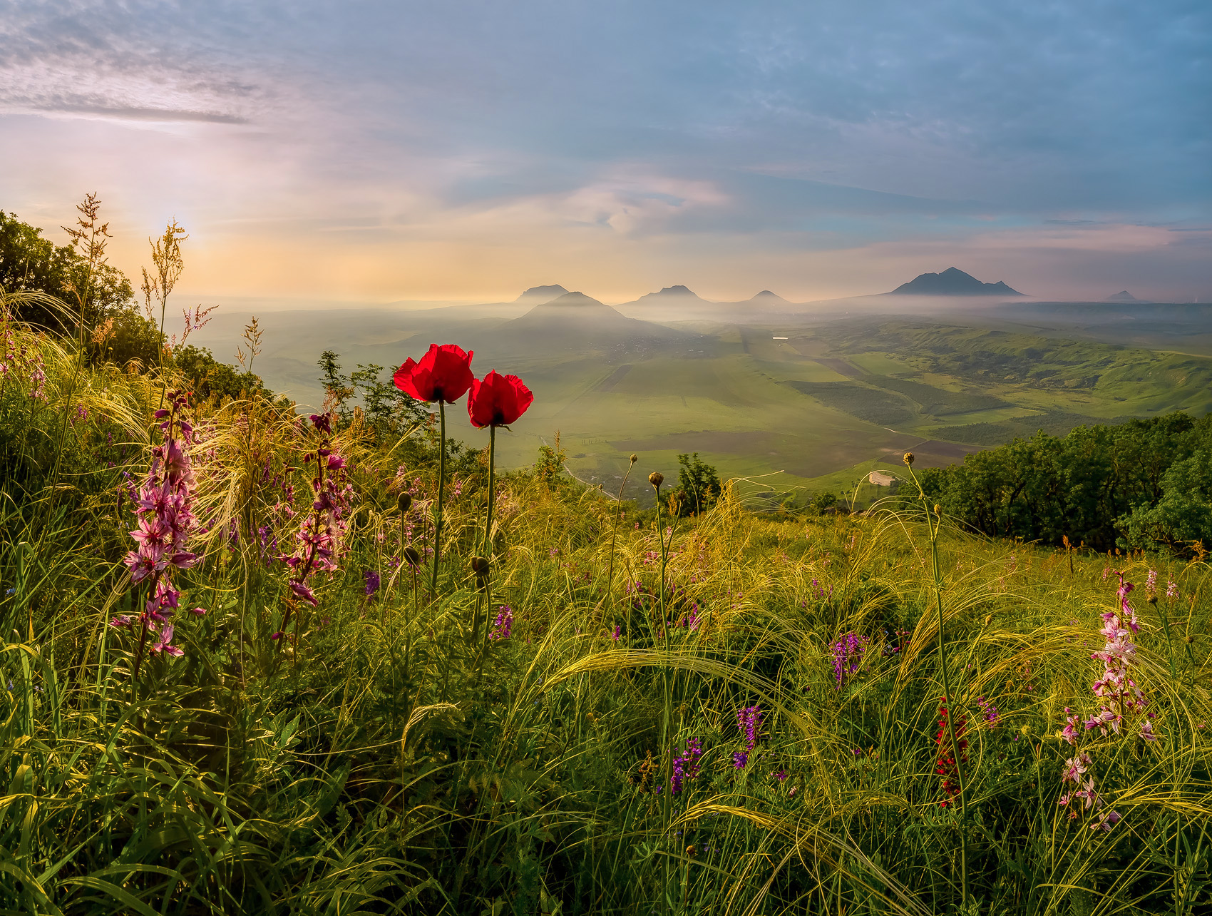 Фотография передаёт тёплый майский рассвет на Кавминводах — яркие маки на переднем плане, зелёные луга и силуэты Бештау и Верблюда в тумане. Снимок выдержан в естественной палитре, с акцентом на контраст цветов и пространства.