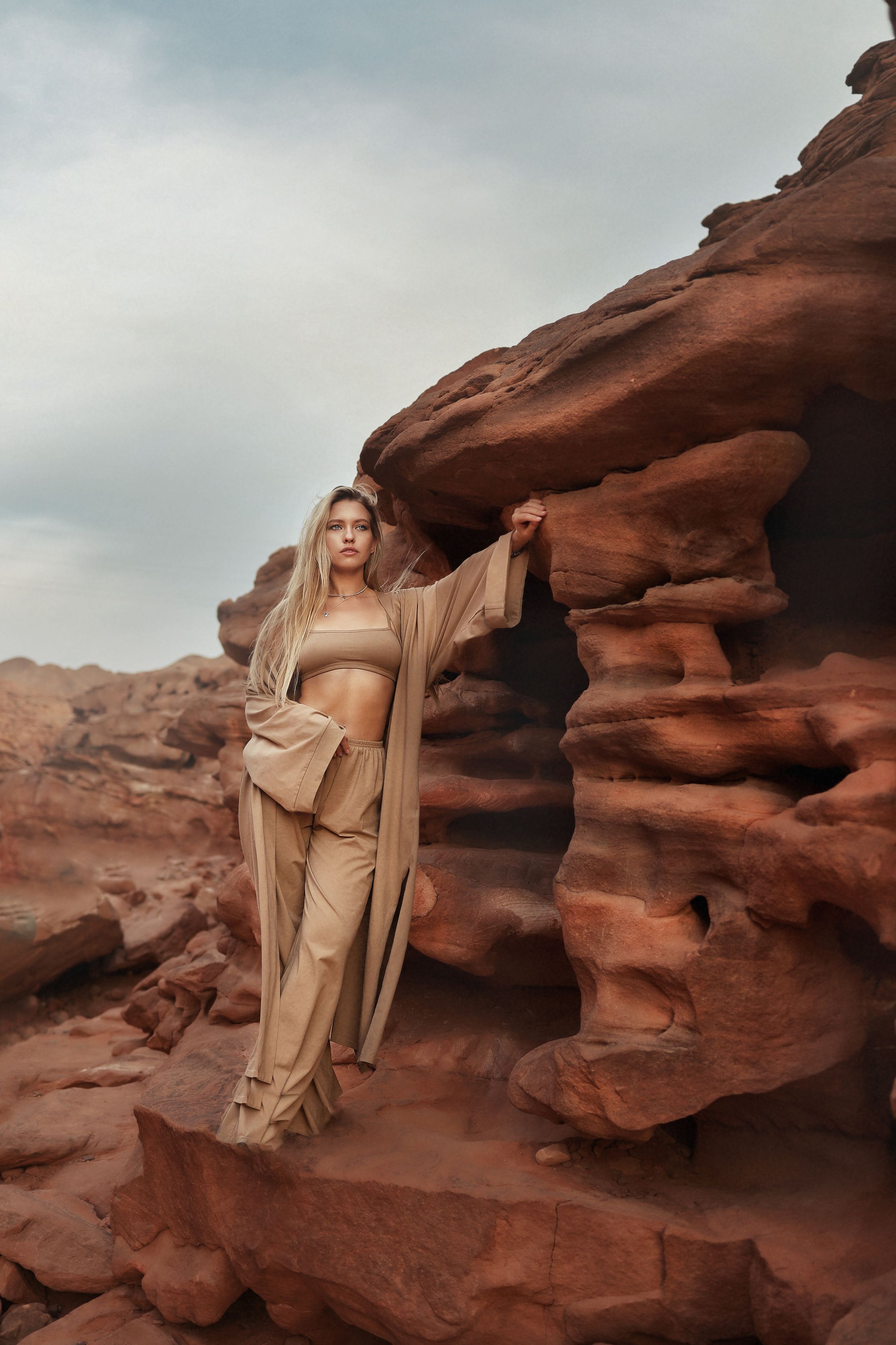 СВЕТЛАНА, снимок выдержан в сдержанной цветовой гамме, что подчёркивает текстуру породы и контраст между фигурой модели и скальным фоном. Костюм модели — в тон пустынной местности — создаёт ощущение естественной вписанности в ландшафт. Интересно, как Вы подходили к композиции: какую позу и ракурс выбрали, чтобы подчеркнуть масштаб каньона и при этом сохранить акцент на фигуре?