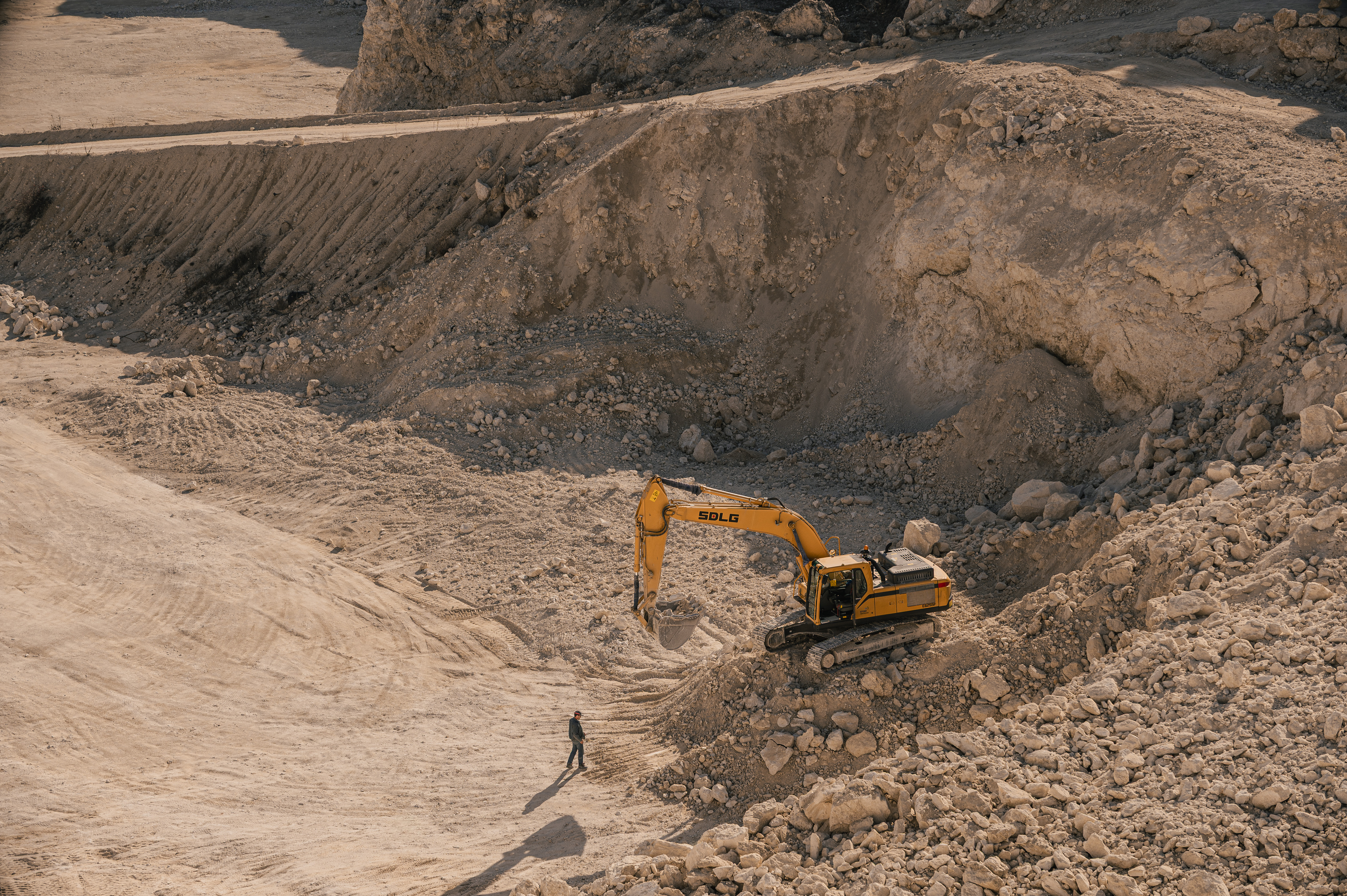 Техника, дороги и конвейеры образуют собственную геометрию пространства, превращая природный рельеф в индустриальный ландшафт. Маленькие фигуры людей и машины становятся точками масштаба в огромной системе добычи, где земля постепенно превращается в структуру линий, текстур и слоёв.