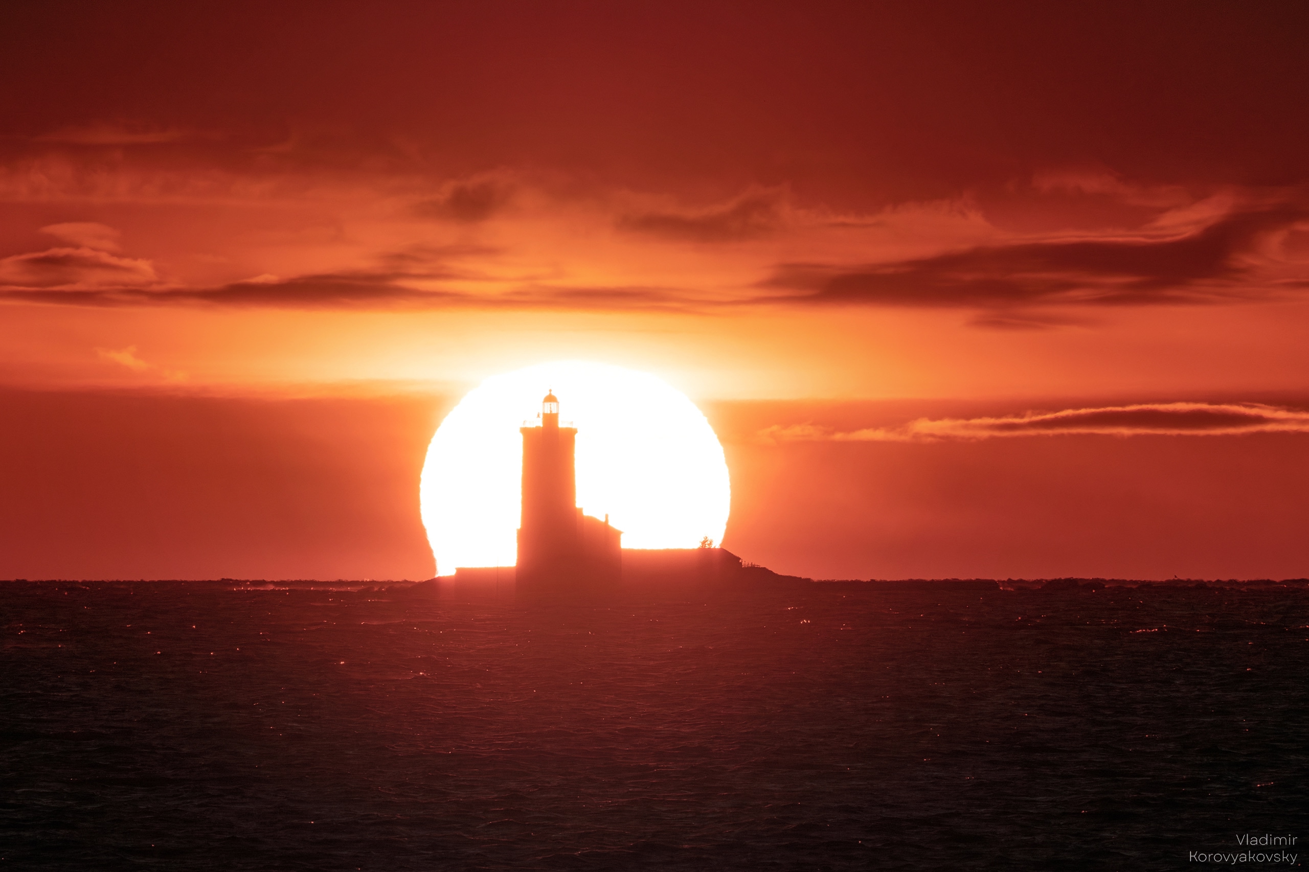 Повезло в тот вечер с погодой и состоянием атмосферы. У самого горизонта плавала тучка, которая красиво подсветилась после захода Солнца за горизонт. А из-за околонулевой температуры атмосфера была относительно спокойной, поэтому маяк не \\\"размазало\\\" вместе с Солнцем по горизонту.