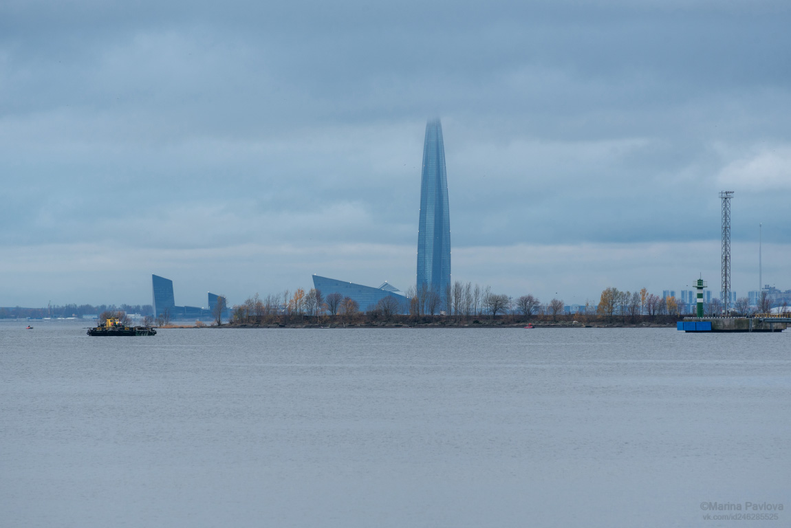 Вид на Финский залив и здание \"Лахта - Центр\" с Балтийского бульвара. Красносельский район. Санкт - Петербург. октябрь 2025г.