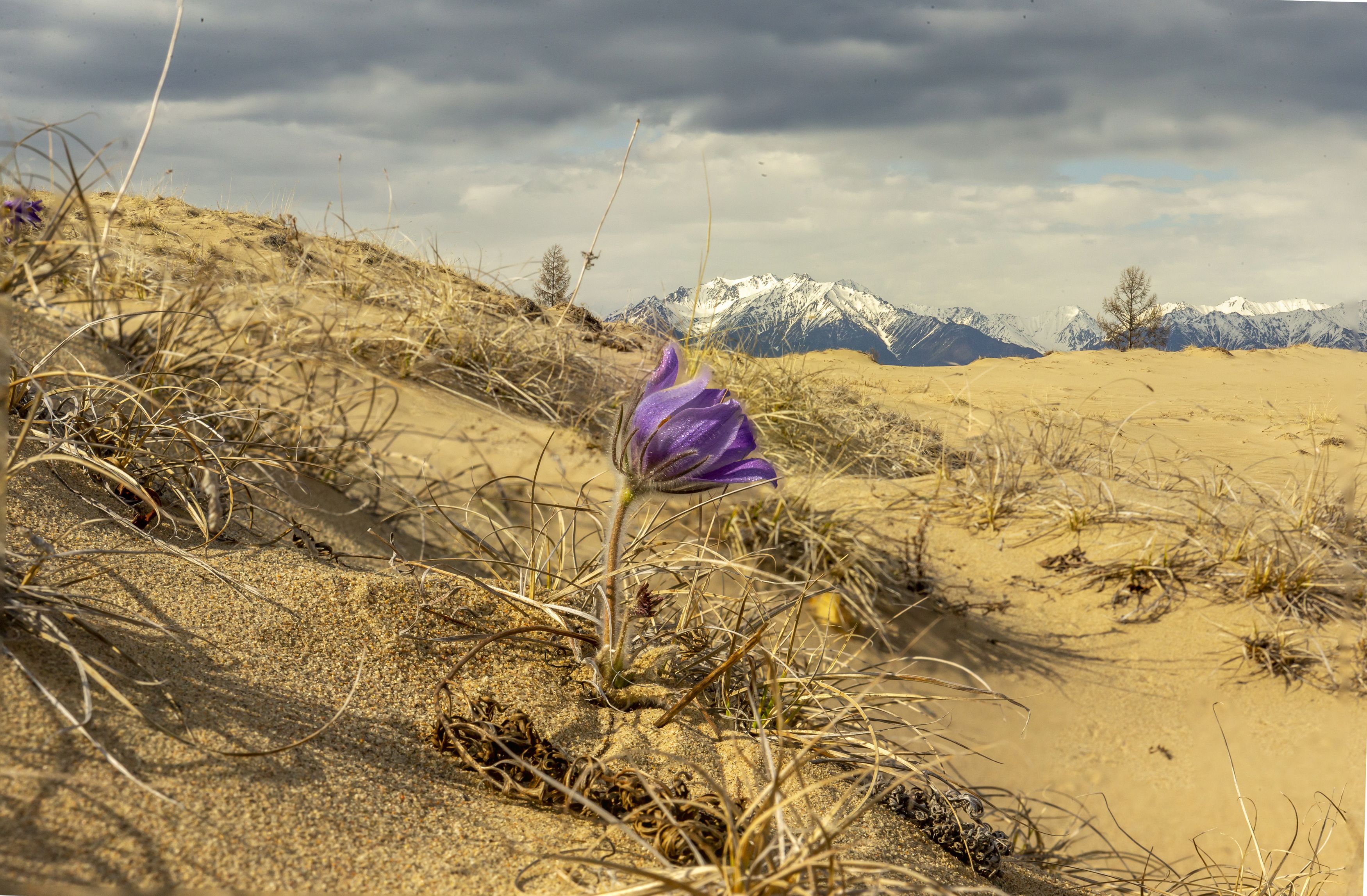 Очень интересное время посещение Чарских песков - середина мая.В это время зацветает Прострел или Сон-трава,который очень живописно смотрится на фоне песков и заснеженных гор.
