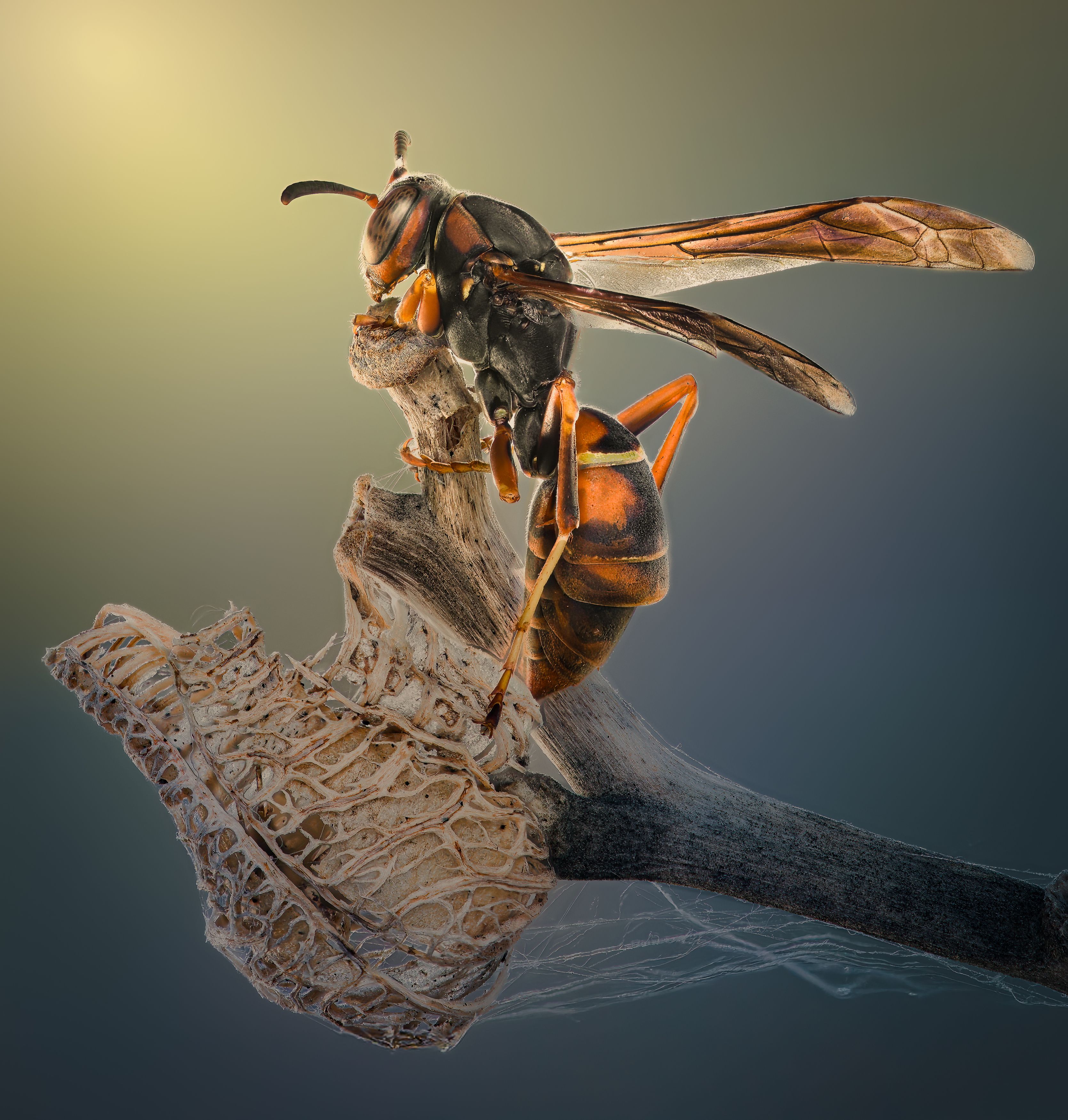 Оса на гнезде: макро в утреннем свете
