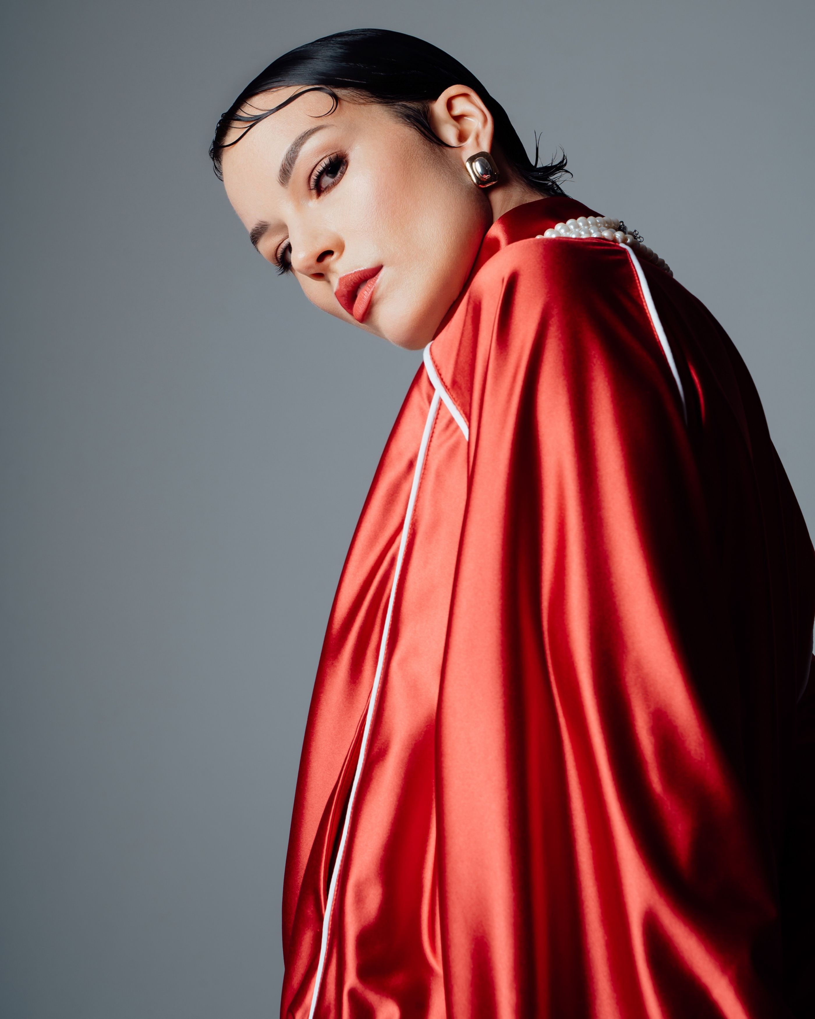 Высокая выразительность образа. Чёткая композиция, сильный цветовой акцент — красный атлас с белой отделкой. Хорошее освещение, акцент на текстуре ткани и деталях — серьги, жемчужная отделка воротника. Эмоциональный взгляд модели, удачный ракурс. 💡📸