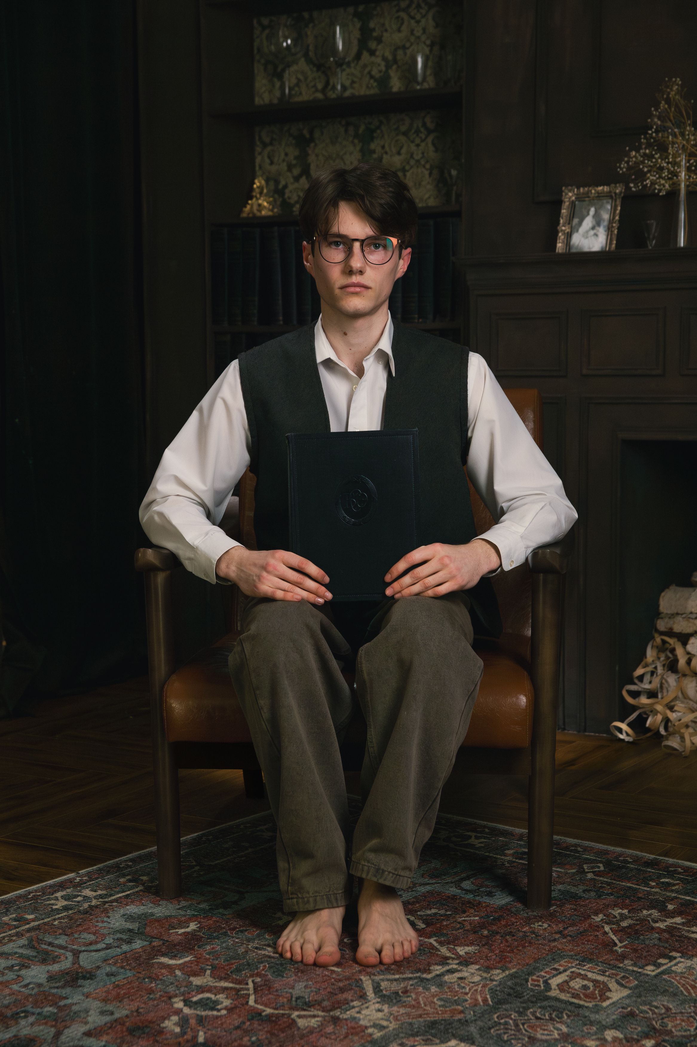 Мужчина в очках сидит в кресле, держа книгу на коленях. Обстановка — тёмная комната с книжными полками, камином и ковром. Освещение мягкое, акцент на лице и книге. Стиль — почти портретный, с элементами классического интерьера. Композиция сбалансирована, взгляд модели прямой, спокойный. Достаточно сдержанно, но выразительно.