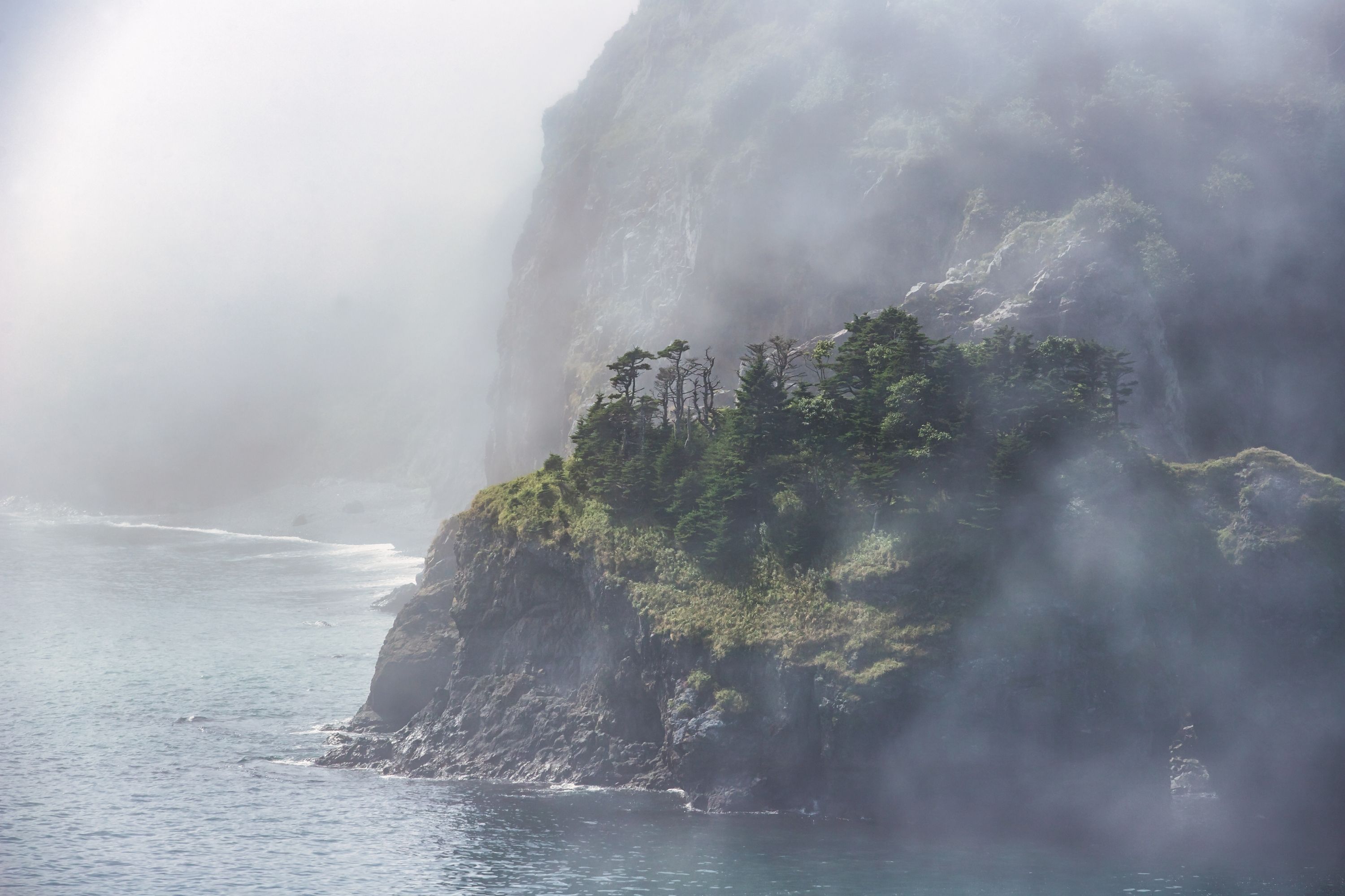 Скользящие туманы на восточном берегу острова Шикотан. Мы приехали в бухту Безымянная и ... поначалу не увидели абсолютно ничего — берег обрывался в белую мглу. Примерно через полчаса ветер начал раздувать густой туман, открывая взору по частям красивейшие шикотанские берега.