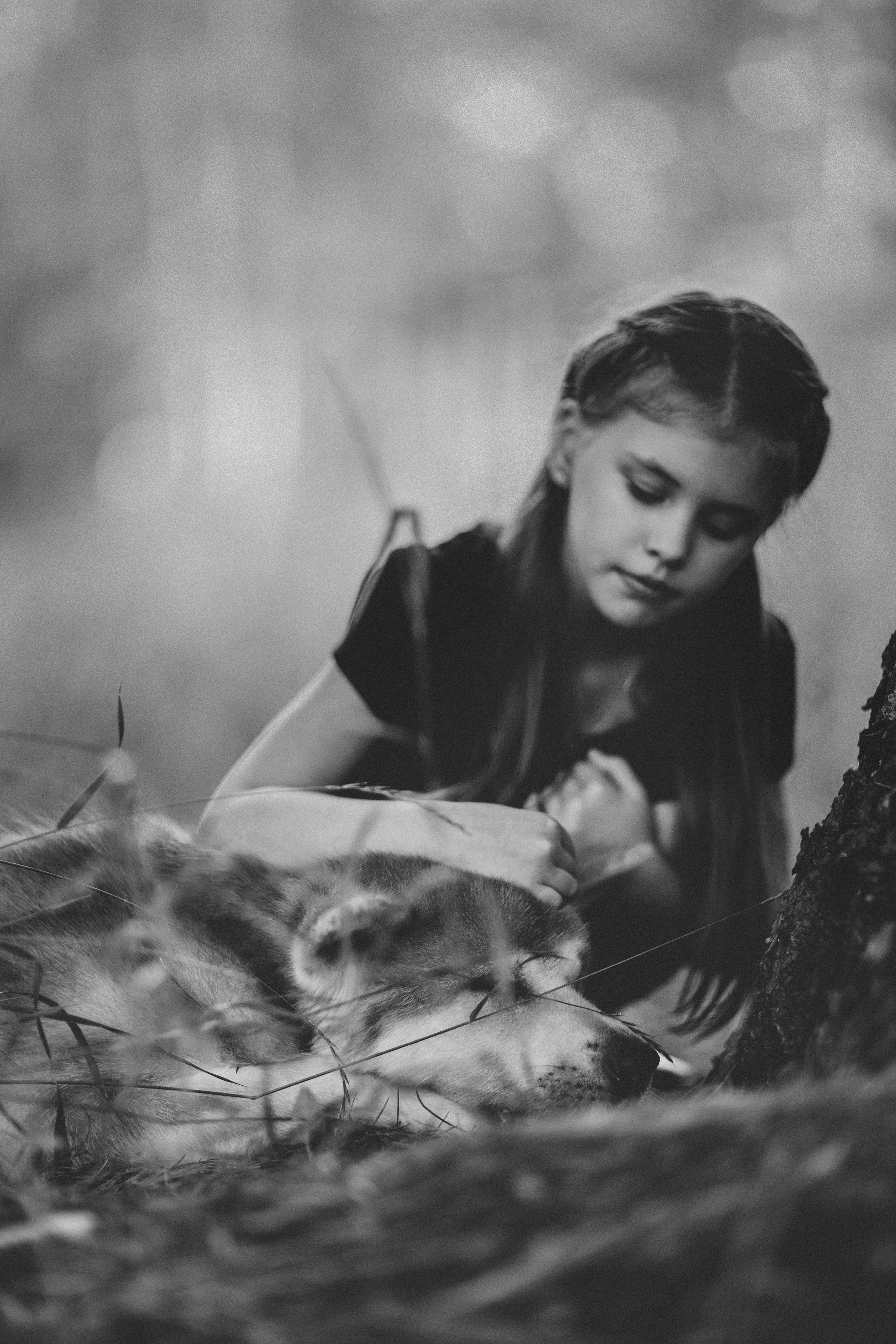 Получилось неплохо — атмосфера тёплая, почти поэтическая. Девочка и собака в лесу, как будто в своём маленьком мире. Чёрно-белое исполнение подчёркивает нежность момента, а размытый фон помогает сосредоточиться на их взаимодействии.