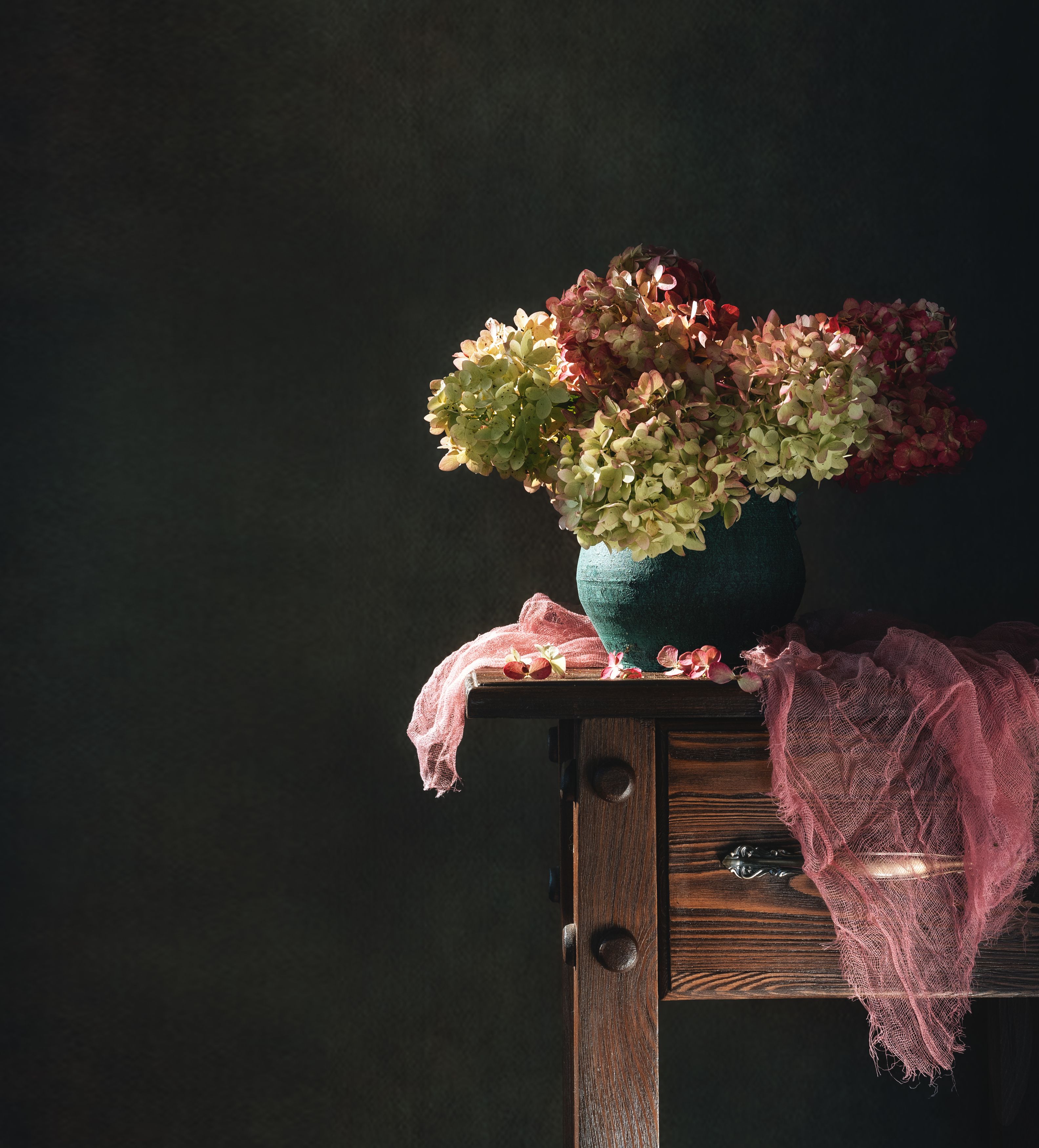 Александра, интересно, как Вы выбрали именно этот цвет вазы — он так контрастирует с тёмным фоном и цветами. Также заметно, что ткань на столе добавляет текстуры — это случайно или продумано?